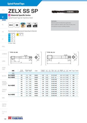 Spiral Fluted Taps Intro ZELX SS SP MS Material Specific Series SP Spiral Fluted Taps for Stainless Steel ANSI FEATURES SL HSS-E OX 2.5P 1.5PTHCHTTHCHT Material specific for blind hole application.Most suitable for stainless steel, steel and alloy steel.OX treatment reduces welding troubles. PO Recommended Tapping Speeds Depending On Materials ISO Vc (m/min) ISO Vc (m/min) P2 ≤10 H M1 ≤10 H P3 ≤10 H ST P4 ≤10 I P7 ≤10 H H 1st choice I suitable ROLL ANSI-ZELX SS SP TYPE: US_002 TYPE: US_014 CARBIDE KDCON KDCON THLLONGLU LK K THL LK K LF LF HAND TAPS UNC TCTR Ø Hole Ø(tolerance)(mm)(mm)CodeTHCHT(chamfer)LF LT THL LU LS DCON K LK(inch)(inch)(inch)(inch)(inch)(inch)(inch)(inch)NOFType Stock ANSI EG (STI) No.2-56UNC GH2 1.8 1.83 Y84623 2.5P 1.75 - 0.157 0.437 - 0.14 0.11 0.187 2 002 f No.3-48UNC GH2 2.09 2.1 Y84600 2.5P 1.812 - 0.197 0.5 - 0.14 0.11 0.187 2 002 f GH2 2.3 2.33 Y84601 2.5P 1.875 - 0.236 0.562 - 0.14 0.11 0.187 2 002 f SPECIAL GH2 2.3 2.33 Y84001 1.5P 1.875 - 0.236 0.562 - 0.14 0.11 0.187 2 002 f THREADS, GH3 2.3 2.33 Y84602 2.5P 1.875 - 0.236 0.562 - 0.14 0.11 0.187 2 002 f GAUGES No.4-40UNC GH3 2.3 2.33 Y84002 1.5P 1.875 - 0.236 0.562 - 0.14 0.11 0.187 2 002 f GH4 2.3 2.33 Y84629 2.5P 1.875 - 0.236 0.562 - 0.14 0.11 0.187 2 002 f THREAD GH5 2.3 2.33 Y84634 2.5P 1.875 - 0.236 0.562 - 0.14 0.11 0.187 2 002 f MILLS GH5 2.3 2.33 Y84034 1.5P 1.875 - 0.236 0.562 - 0.14 0.11 0.187 2 002 f GH2 2.6 2.64 Y84603 2.5P 1.937 - 0.236 0.625 - 0.14 0.11 0.187 3 002 f No.5-40UNC GH2 2.6 2.64 Y84003 1.5P 1.937 - 0.236 0.625 - 0.14 0.11 0.187 3 002 f DIES CENTER DRILLS Technical info 180
