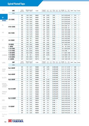 Spiral Fluted Taps Intro UNC TCTR Ø Hole Ø(tolerance)(mm)(mm)CodeTHCHT(chamfer)LF LT THL LU LS DCON K LK(inch)(inch)(inch)(inch)(inch)(inch)(inch)(inch)NOFTypeStock ANSI GH3 10.9 10.91 Y84621 2.5P 3.375 - 0.63 - - 0.37 0.275 0.437 3 014 f SP GH3 10.9 10.91 Y84021 1.5P 3.375 - 0.63 - - 0.37 0.275 0.437 3 014 f ANSI 1/2-13UNC GH5 10.9 10.91 Y84651 2.5P 3.375 - 0.63 - - 0.37 0.275 0.437 3 014 f GH5 10.9 10.91 Y84051 1.5P 3.375 - 0.63 - - 0.37 0.275 0.437 3 014 f GH7 10.9 10.91 Y84681 2.5P 3.375 - 0.63 - - 0.37 0.275 0.437 3 014 f SL GH3 12.2 12.33 Y84653 2.5P 3.593 - 0.709 - - 0.43 0.322 0.5 3 014 f 9/16-12UNC GH3 12.2 12.33 Y84053 1.5P 3.593 - 0.709 - - 0.43 0.322 0.5 3 014 f GH3 13.6 13.75 Y84625 2.5P 3.812 - 0.748 - - 0.48 0.36 0.562 3 014 f PO 5/8-11UNC GH3 13.6 13.75 Y84025 1.5P 3.812 - 0.748 - - 0.48 0.36 0.562 3 014 f GH5 13.6 13.75 Y84655 2.5P 3.812 - 0.748 - - 0.48 0.36 0.562 3 014 f GH5 13.6 13.75 Y84055 1.5P 3.812 - 0.748 - - 0.48 0.36 0.562 3 014 f GH3 16.6 16.7 Y84627 2.5P 4.25 - 0.827 - - 0.59 0.442 0.687 4 014 f ST 3/4-10UNC GH3 16.6 16.7 Y84027 1.5P 4.25 - 0.827 - - 0.59 0.442 0.687 4 014 f GH5 16.6 16.7 Y84657 2.5P 4.25 - 0.827 - - 0.59 0.442 0.687 4 014 f 7/8-9UNC GH4 19.6 19.61 Y84695 2.5P 4.687 - 0.827 - - 0.7 0.523 0.75 4 014 f ROLL 1 -8UNC1 1/8-7UNC GH4 22.3 22.45 Y84697 2.5P 5.125 - 0.984 - - 0.8 0.6 0.812 4 014 fGH62525.17Y847012.5P5.437-1.181--0.90.672 0.8754014f 1 1/4-7UNC GH6 28.2 28.35 Y84703 2.5P 5.75 - 1.181 - - 1.02 0.766 1 4 014 f 1 3/8-6UNC GH6 30.8 30.92 Y84706 2.5P 6.062 - 1.575 - - 1.11 0.831 1.062 4 014 f CARBIDE 1 1/2-6UNC GH6 34 34.1 Y84709 2.5P 6.375 - 1.575 - - 1.23 0.925 1.125 4 014 f 1 3/4-5UNC GH7 39.5 39.61 Y84714 2.5P 7 - 1.772 - - 1.43 1.072 1.25 4 014 f 2 -4.5UNC GH7 45.2 45.37 Y84715 2.5P 7.625 - 1.969 - - 1.64 1.233 1.375 4 014 f LONG UNF TCTR Ø Hole Ø(tolerance)(mm)(mm)CodeTHCHT(chamfer)LF LT THL LU LS DCON K LK(inch)(inch)(inch)(inch)(inch)(inch)(inch)(inch)NOFTypeStock ANSI GH2 2.4 2.41 Y84683 2.5P 1.875 - 0.236 0.562 - 0.14 0.11 0.187 2 002 f No.4-48UNF HAND GH2 2.4 2.41 Y84083 1.5P 1.875 - 0.236 0.562 - 0.14 0.11 0.187 2 002 f TAPS GH2 2.9 2.97 Y84684 2.5P 2 - 0.276 0.687 - 0.14 0.11 0.187 3 002 f GH2 2.9 2.97 Y84084 1.5P 2 - 0.276 0.687 - 0.14 0.11 0.187 3 002 f No.6-40UNF GH3 2.9 2.97 Y84685 2.5P 2 - 0.276 0.687 - 0.14 0.11 0.187 3 002 f EG (STI) GH3 2.9 2.97 Y84085 1.5P 2 - 0.276 0.687 - 0.14 0.11 0.187 3 002 f No.8-36UNF GH3 3.5 3.55 Y84687 2.5P 2.125 - 0.276 0.75 - 0.17 0.131 0.25 3 002 f GH2 4.1 4.12 Y84611 2.5P 2.375 - 0.276 0.875 - 0.19 0.152 0.25 3 002 f SPECIAL GH3 4.1 4.12 Y84610 2.5P 2.375 - 0.276 0.875 - 0.19 0.152 0.25 3 002 f THREADS,GAUGES GH3 4.1 4.12 Y84010 1.5P 2.375 - 0.276 0.875 - 0.19 0.152 0.25 3 002 f GH4 4.1 4.12 Y84630 2.5P 2.375 - 0.276 0.875 - 0.19 0.152 0.25 3 002 f No.10-32UNF GH5 4.1 4.12 Y84640 2.5P 2.375 - 0.276 0.875 - 0.19 0.152 0.25 3 002 f THREAD GH5 4.1 4.12 Y84040 1.5P 2.375 - 0.276 0.875 - 0.19 0.152 0.25 3 002 f MILLS GH6 4.1 4.12 Y84662 2.5P 2.375 - 0.276 0.875 - 0.19 0.152 0.25 3 002 f GH7 4.1 4.12 Y84670 2.5P 2.375 - 0.276 0.875 - 0.19 0.152 0.25 3 002 f No.12-28UNF GH3 4.6 4.67 Y84689 2.5P 2.375 - 0.276 0.937 - 0.22 0.165 0.281 3 002 f DIES GH3 5.5 5.53 Y84614 2.5P 2.5 - 0.354 1 - 0.26 0.191 0.312 3 002 f GH3 5.5 5.53 Y84014 1.5P 2.5 - 0.354 1 - 0.26 0.191 0.312 3 002 f GH4 5.5 5.53 Y84631 2.5P 2.5 - 0.354 1 - 0.26 0.191 0.312 3 002 f CENTER 1/4-28UNF GH5 5.5 5.53 Y84644 2.5P 2.5 - 0.354 1 - 0.26 0.191 0.312 3 002 f DRILLS GH5 5.5 5.53 Y84044 2.5P 2.5 - 0.354 1 - 0.26 0.191 0.312 3 002 f GH6 5.5 5.53 Y84664 2.5P 2.5 - 0.354 1 - 0.26 0.191 0.312 3 002 f GH7 5.5 5.53 Y84674 2.5P 2.5 - 0.354 1 - 0.26 0.191 0.312 3 002 f Technical info 182
