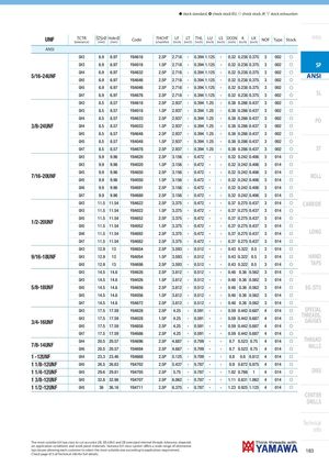 h stock standard, ) check stock EU, f check stock JP, m stock exhaustion UNF TCTR Ø Hole Ø(tolerance)(mm)(mm)CodeTHCHT(chamfer)LF LT THL LU LS DCON K LK(inch)(inch)(inch)(inch)(inch)(inch)(inch)(inch)NOFTypeStockIntro ANSI GH3 6.9 6.97 Y84616 2.5P 2.718 - 0.394 1.125 - 0.32 0.238 0.375 3 002 f GH3 6.9 6.97 Y84016 1.5P 2.718 - 0.394 1.125 - 0.32 0.238 0.375 3 002 f SP 5/16-24UNF GH4 6.9 6.97 Y84632 2.5P 2.718 - 0.394 1.125 - 0.32 0.238 0.375 3 002 f ANSI GH5 6.9 6.97 Y84646 2.5P 2.718 - 0.394 1.125 - 0.32 0.238 0.375 3 002 f GH5 6.9 6.97 Y84046 2.5P 2.718 - 0.394 1.125 - 0.32 0.238 0.375 3 002 f GH7 6.9 6.97 Y84676 2.5P 2.718 - 0.394 1.125 - 0.32 0.238 0.375 3 002 f SL GH3 8.5 8.57 Y84618 2.5P 2.937 - 0.394 1.25 - 0.38 0.286 0.437 3 002 f GH3 8.5 8.57 Y84018 1.5P 2.937 - 0.394 1.25 - 0.38 0.286 0.437 3 002 f GH4 8.5 8.57 Y84633 2.5P 2.937 - 0.394 1.25 - 0.38 0.286 0.437 3 002 f PO 3/8-24UNF GH4 8.5 8.57 Y84033 1.5P 2.937 - 0.394 1.25 - 0.38 0.286 0.437 3 002 f GH5 8.5 8.57 Y84648 2.5P 2.937 - 0.394 1.25 - 0.38 0.286 0.437 3 002 f GH5 8.5 8.57 Y84048 1.5P 2.937 - 0.394 1.25 - 0.38 0.286 0.437 3 002 f GH7 8.5 8.57 Y84678 2.5P 2.937 - 0.394 1.25 - 0.38 0.286 0.437 3 002 f ST GH3 9.9 9.96 Y84620 2.5P 3.156 - 0.472 - - 0.32 0.242 0.406 3 014 f GH3 9.9 9.96 Y84020 1.5P 3.156 - 0.472 - - 0.32 0.242 0.406 3 014 f GH5 9.9 9.96 Y84650 2.5P 3.156 - 0.472 - - 0.32 0.242 0.406 3 014 f 7/16-20UNF GH5 9.9 9.96 Y84050 1.5P 3.156 - 0.472 - - 0.32 0.242 0.406 3 014 f ROLL GH6 9.9 9.96 Y84691 2.5P 3.156 - 0.472 - - 0.32 0.242 0.406 3 014 f GH7 9.9 9.96 Y84680 2.5P 3.156 - 0.472 - - 0.32 0.242 0.406 3 014 f GH3 11.5 11.54 Y84622 2.5P 3.375 - 0.472 - - 0.37 0.275 0.437 3 014 f CARBIDE GH3 11.5 11.54 Y84022 1.5P 3.375 - 0.472 - - 0.37 0.275 0.437 3 014 f GH5 11.5 11.54 Y84652 2.5P 3.375 - 0.472 - - 0.37 0.275 0.437 3 014 f 1/2-20UNF GH5 11.5 11.54 Y84052 1.5P 3.375 - 0.472 - - 0.37 0.275 0.437 3 014 f GH6 11.5 11.54 Y84692 2.5P 3.375 - 0.472 - - 0.37 0.275 0.437 3 014 f LONG GH7 11.5 11.54 Y84682 2.5P 3.375 - 0.472 - - 0.37 0.275 0.437 3 014 f GH3 12.9 13 Y84654 2.5P 3.593 - 0.512 - - 0.43 0.322 0.5 3 014 f 9/16-18UNF GH3 12.9 13 Y84054 1.5P 3.593 - 0.512 - - 0.43 0.322 0.5 3 014 f HAND GH5 12.9 13 Y84698 2.5P 3.593 - 0.512 - - 0.43 0.322 0.5 3 014 f TAPS GH3 14.5 14.6 Y84626 2.5P 3.812 - 0.512 - - 0.48 0.36 0.562 3 014 f GH3 14.5 14.6 Y84026 1.5P 3.812 - 0.512 - - 0.48 0.36 0.562 3 014 f 5/8-18UNF GH5 14.5 14.6 Y84656 2.5P 3.812 - 0.512 - - 0.48 0.36 0.562 3 014 f EG (STI) GH5 14.5 14.6 Y84056 1.5P 3.812 - 0.512 - - 0.48 0.36 0.562 3 014 f GH7 14.5 14.6 Y84672 2.5P 3.812 - 0.512 - - 0.48 0.36 0.562 3 014 f GH3 17.5 17.59 Y84628 2.5P 4.25 - 0.591 - - 0.59 0.442 0.687 4 014 f SPECIAL 3/4-16UNF GH3 17.5 17.59 Y84028 1.5P 4.25 - 0.591 - - 0.59 0.442 0.687 4 014 f THREADS,GAUGES GH5 17.5 17.59 Y84658 2.5P 4.25 - 0.591 - - 0.59 0.442 0.687 4 014 f GH7 17.5 17.59 Y84686 2.5P 4.25 - 0.591 - - 0.59 0.442 0.687 4 014 f GH4 20.5 20.57 Y84696 2.5P 4.687 - 0.709 - - 0.7 0.523 0.75 4 014 f THREAD 7/8-14UNF GH6 20.5 20.57 Y84694 2.5P 4.687 - 0.709 - - 0.7 0.523 0.75 4 014 f MILLS 1 -12UNF GH4 23.3 23.46 Y84668 2.5P 5.125 - 0.709 - - 0.8 0.6 0.812 4 014 f 1 1/8-12UNF GH5 26.5 26.63 Y84702 2.5P 5.437 - 0.787 - - 0.9 0.672 0.875 4 014 f 1 1/4-12UNF GH5 29.6 29.81 Y84705 2.5P 5.75 - 0.787 - - 1.02 0.766 1 4 014 f DIES 1 3/8-12UNF GH5 32.8 32.98 Y84707 2.5P 6.062 - 0.787 - - 1.11 0.831 1.062 4 014 f 1 1/2-12UNF GH5 36 36.16 Y84711 2.5P 6.375 - 0.787 - - 1.23 0.925 1.125 4 014 f CENTER DRILLS Technical info The most suitable GH tap class to cut accurate 2B, 3B (UNJ) and 2B oversized internal threads tolerance, depends on application conditions and work-piece materials. Yamawa GH class system offers a wide range of alternative tap classes allowing each customer to select the most suitable one according to application requirement. 183 Check page 673 of Technical info for full details.