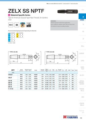 h stock standard, ) check stock EU, f check stock JP, m stock exhaustion ZELX SS NPTF Intro MS Material Specific Series Taps for American Dryseal Taper Pipe Threads, for stainless SP steel ANSI FEATURES HSS-E OX 2.5PTHCHT Material specific for blind hole application.Most suitable for stainless steel, steel and alloy steel. SLOX treatment reduces welding troubles. Recommended Tapping Speeds Depending On Materials PO ISO Vc (m/min) ISO Vc (m/min) P2 ≤5 H M1 ≤5 H P3 ≤5 H M2 ≤5 H P4 ≤5 I ST P7 ≤5 H H 1st choice I suitable ROLL ANSI-ZELX SS NPTF TYPE: US_055 TYPE: US_056 DCON K K CARBIDEDCON THL LK K THL LK K LONG LF LF HAND NPTF TCTR Ø Hole Ø(tolerance)(mm)(mm)CodeTHCHT(chamfer)Basicmajor Ø(mm)LF(inch)THL(inch)LSDCON K(inch)(inch)(inch)LK(inch)NOFTypeStock TAPS ANSI 1/16-27 ANSI G 5.95 5.99 Y83660 2.5P 7.770 2.125 0.687 - 0.31 0.234 0.375 4 055 f EG (STI) ANSI G 8.3 8.34 Y83661 2.5P 10.117 2.125 0.75 - 0.44 0.328 0.375 4 055 f 1/8-27 ANSI G 8.3 8.34 Y83662 2.5P 10.117 2.125 0.75 - 0.31 0.234 0.375 4 056 f 1/4-18 ANSI G 10.7 10.75 Y83663 2.5P 13.426 2.437 1.062 - 0.56 0.421 0.437 4 055 f SPECIAL 3/8-18 ANSI G 14.1 14.17 Y83664 2.5P 16.866 2.562 1.062 - 0.7 0.531 0.5 4 055 f THREADS, 1/2-14 ANSI G 17.4 17.44 Y83665 2.5P 20.980 3.125 1.375 - 0.69 0.515 0.625 4 056 f GAUGES 3/4-14 ANSI G 22.7 22.75 Y83666 2.5P 26.325 3.25 1.375 - 0.91 0.679 0.687 4 056 f 1 -11 1/2 ANSI G 28.5 28.6 Y83667 2.5P 32.934 3.75 1.75 - 1.13 0.843 0.812 4 056 f THREAD MILLS DIES CENTER DRILLS Technical info 185