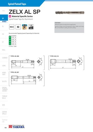 Spiral Fluted Taps Intro ZELX AL SP MS Material Specific Series SP Spiral Fluted Taps for Aluminium ANSI FEATURES SL HSS-E NI 2.5PTHCHT Material specific for blind hole application.Specific design and NI treatment allow stable and longlife on Aluminium casting and die-casting. PO Recommended Tapping Speeds Depending On Materials ISO Vc (m/min) N1 10÷25 H N2 10÷25 H ST N3 10÷25 H N4 10÷25 H H 1st choice I suitable ROLL ANSI-ZELX AL SP TYPE: US_002 TYPE: US_014 CARBIDE KDCON KDCON THLLONGLU LK K THL LK K LF LF HAND TYPE: US_007 TAPS K DCON THL LK K EG (STI) LS LF SPECIAL THREADS, GAUGES THREAD MILLS DIES CENTER DRILLS Technical info 186