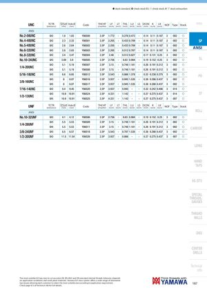 h stock standard, ) check stock EU, f check stock JP, m stock exhaustion UNC TCTR Ø Hole Ø(tolerance)(mm)(mm)CodeTHCHT(chamfer)LF LT THL LU LS DCON K LK(inch)(inch)(inch)(inch)(inch)(inch)(inch)(inch)NOFTypeStockIntro ANSI No.2-56UNC GH2 1.8 1.83 Y86500 2.5P 1.772 - 0.276 0.472 - 0.14 0.11 0.187 2 002 f No.4-40UNC GH2 2.3 2.33 Y86501 2.5P 2.205 - 0.433 0.709 - 0.14 0.11 0.187 2 002 f SP No.5-40UNCNo.6-32UNC GH2 2.6 2.64 Y86502 2.5P 2.205 - 0.433 0.709 - 0.14 0.11 0.187 3 002 f ANSIGH32.82.83Y865032.5P2.205-0.512 0.787-0.140.110.1873002f No.8-32UNC GH3 3.4 3.47 Y86504 2.5P 2.48 - 0.512 0.827 - 0.17 0.131 0.25 3 002 f No.10-24UNC GH3 3.89 3.9 Y86505 2.5P 2.756 - 0.63 0.984 - 0.19 0.152 0.25 3 002 f SL GH3 5.1 5.19 Y86507 2.5P 3.15 - 0.748 1.181 - 0.26 0.191 0.312 3 002 f 1/4-20UNC GH5 5.1 5.19 Y86508 2.5P 3.15 - 0.748 1.181 - 0.26 0.191 0.312 3 002 f 5/16-18UNC GH3 6.6 6.65 Y86512 2.5P 3.543 - 0.866 1.378 - 0.32 0.238 0.375 3 002 f PO GH3 8 8.07 Y86516 2.5P 3.937 - 0.945 1.535 - 0.38 0.286 0.437 3 002 f 3/8-16UNC GH5 8 8.07 Y86517 2.5P 3.937 - 0.945 1.535 - 0.38 0.286 0.437 3 002 f 7/16-14UNC GH3 9.4 9.45 Y86520 2.5P 3.937 - 0.945 - - 0.32 0.242 0.406 3 014 f GH3 10.9 10.91 Y86524 2.5P 4.331 - 1.142 - - 0.37 0.275 0.437 3 014 f ST 1/2-13UNC GH5 10.9 10.91 Y86525 2.5P 4.331 - 1.142 - - 0.37 0.275 0.437 3 007 f UNF TCTR Ø Hole Ø(tolerance)(mm)(mm)CodeTHCHT(chamfer)LF LT THL LU LS DCON K LK(inch)(inch)(inch)(inch)(inch)(inch)(inch)(inch)NOFTypeStock ANSI ROLL No.10-32UNF GH3 4.1 4.12 Y86506 2.5P 2.756 - 0.63 0.984 - 0.19 0.152 0.25 3 002 f GH3 5.5 5.53 Y86509 2.5P 3.15 - 0.748 1.181 - 0.26 0.191 0.312 3 002 f 1/4-28UNF GH4 5.5 5.53 Y86511 2.5P 3.15 - 0.748 1.181 - 0.26 0.191 0.312 3 002 f CARBIDE 3/8-24UNF GH3 8.5 8.57 Y86518 2.5P 3.543 - 0.787 1.535 - 0.38 0.286 0.437 3 002 f 1/2-20UNF GH3 11.5 11.54 Y86526 2.5P 3.937 - 0.866 - - 0.37 0.275 0.437 3 007 f LONG HAND TAPS EG (STI) SPECIAL THREADS, GAUGES THREAD MILLS DIES CENTER DRILLS Technical info The most suitable GH tap class to cut accurate 2B, 3B (UNJ) and 2B oversized internal threads tolerance, depends on application conditions and work-piece materials. Yamawa GH class system offers a wide range of alternative tap classes allowing each customer to select the most suitable one according to application requirement. 187 Check page 673 of Technical info for full details.