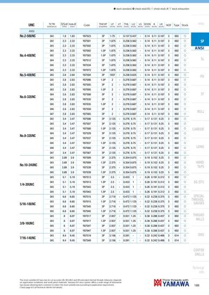 h stock standard, ) check stock EU, f check stock JP, m stock exhaustion UNC TCTR Ø Hole Ø(tolerance)(mm)(mm)CodeTHCHT(chamfer)LF LT THL LU LS DCON K LK(inch)(inch)(inch)(inch)(inch)(inch)(inch)(inch)NOFTypeStockIntro ANSI No.2-56UNC GH2 1.8 1.83 Y87523 3P 1.75 - 0.157 0.437 - 0.14 0.11 0.187 3 002 f GH2 2.3 2.33 Y87501 3P 1.875 - 0.236 0.562 - 0.14 0.11 0.187 3 002 f SP GH3 2.3 2.33 Y87502 3P 1.875 - 0.236 0.562 - 0.14 0.11 0.187 3 002 f ANSI GH3 2.3 2.33 Y87002 1.5P 1.875 - 0.236 0.562 - 0.14 0.11 0.187 3 002 f No.4-40UNC GH2 2.3 2.33 Y87583 1.5P 1.875 - 0.236 0.562 - 0.14 0.11 0.187 3 002 f GH4 2.3 2.33 Y87512 3P 1.875 - 0.236 0.562 - 0.14 0.11 0.187 3 002 f SL GH5 2.3 2.33 Y87534 3P 1.875 - 0.236 0.562 - 0.14 0.11 0.187 3 002 f GH5 2.3 2.33 Y87072 1.5P 1.875 - 0.236 0.562 - 0.14 0.11 0.187 3 002 f No.5-40UNC GH2 2.6 2.64 Y87504 3P 1937 - 0.236 0.625 - 0.14 0.11 0.187 3 002 f PO GH2 2.8 2.83 Y87006 1.5P 2 - 0.276 0.687 - 0.14 0.11 0.187 3 002 f GH3 2.8 2.83 Y87505 3P 2 - 0.276 0.687 - 0.14 0.11 0.187 3 002 f GH3 2.8 2.83 Y87005 1.5P 2 - 0.276 0.687 - 0.14 0.11 0.187 3 002 f GH4 2.8 2.83 Y87508 3P 2 - 0.276 0.687 - 0.14 0.11 0.187 3 002 f ST No.6-32UNC GH5 2.8 2.83 Y87535 3P 2 - 0.276 0.687 - 0.14 0.11 0.187 3 002 f GH5 2.8 2.83 Y87035 1.5P 2 - 0.276 0.687 - 0.14 0.11 0.187 3 002 f GH6 2.8 2.83 Y87559 3P 2 - 0.276 0.687 - 0.14 0.11 0.187 3 002 f GH7 2.8 2.83 Y87565 3P 2 - 0.276 0.687 - 0.14 0.11 0.187 3 002 f ROLL GH2 3.4 3.47 Y87506 3P 2.125 - 0.276 0.75 - 0.17 0.131 0.25 3 002 f GH3 3.4 3.47 Y87507 3P 2.125 - 0.276 0.75 - 0.17 0.131 0.25 3 002 f GH3 3.4 3.47 Y87580 1.5P 2.125 - 0.276 0.75 - 0.17 0.131 0.25 3 002 f CARBIDE GH4 3.4 3.47 Y87529 3P 2.125 - 0.276 0.75 - 0.17 0.131 0.25 3 002 f No.8-32UNC GH5 3.4 3.47 Y87537 3P 2.125 - 0.276 0.75 - 0.17 0.131 0.25 3 002 f GH5 3.4 3.47 Y87037 1.5P 2.125 - 0.276 0.75 - 0.17 0.131 0.25 3 002 f GH6 3.4 3.47 Y87560 3P 2.125 - 0.276 0.75 - 0.17 0.131 0.25 3 002 f LONG GH7 3.4 3.47 Y87567 3P 2.125 - 0.276 0.75 - 0.17 0.131 0.25 3 002 f GH3 3.89 3.9 Y87509 3P 2.375 - 0.354 0.875 - 0.19 0.152 0.25 3 002 f GH3 3.89 3.9 Y87009 1.5P 2.375 - 0.354 0.875 - 0.19 0.152 0.25 3 002 f HAND No.10-24UNC GH5 3.89 3.9 Y87539 3P 2.375 - 0.354 0.875 - 0.19 0.152 0.25 3 002 f TAPS GH5 3.89 3.9 Y87039 1.5P 2.375 - 0.354 0.875 - 0.19 0.152 0.25 3 002 f GH3 5.1 5.19 Y87513 3P 2.5 - 0.433 1 - 0.26 0.191 0.312 3 002 f GH3 5.1 5.19 Y87013 1.5P 2.5 - 0.433 1 - 0.26 0.191 0.312 3 002 f EG (STI) 1/4-20UNC GH5 5.1 5.19 Y87543 3P 2.5 - 0.433 1 - 0.26 0.191 0.312 3 002 f GH5 5.1 5.19 Y87043 1.5P 2.5 - 0.433 1 - 0.26 0.191 0.312 3 002 f GH3 6.6 6.65 Y87515 3P 2.718 - 0.472 1.125 - 0.32 0.238 0.375 3 002 f SPECIAL 5/16-18UNC GH3 6.6 6.65 Y87015 1.5P 2.718 - 0.472 1.125 - 0.32 0.238 0.375 3 002 f THREADS,GAUGES GH5 6.6 6.65 Y87545 3P 2.718 - 0.472 1.125 - 0.32 0.238 0.375 3 002 f GH5 6.6 6.65 Y87045 1.5P 2.718 - 0.472 1.125 - 0.32 0.238 0.375 3 002 f GH3 8 8.07 Y87517 3P 2.937 - 0.551 1.25 - 0.38 0.286 0.437 3 002 f THREAD GH3 8 8.07 Y87017 1.5P 2.937 - 0.551 1.25 - 0.38 0.286 0.437 3 002 f MILLS 3/8-16UNC GH5 8 8.07 Y87547 3P 2.937 - 0.551 1.25 - 0.38 0.286 0.437 3 002 f GH5 8 8.07 Y87047 1.5P 2.937 - 0.551 1.25 - 0.38 0.286 0.437 3 002 f GH3 9.4 9.45 Y87519 3P 3.156 - 0.591 - - 0.32 0.242 0.406 3 014 f DIES 7/16-14UNC GH5 9.4 9.45 Y87549 3P 3.156 - 0.591 - - 0.32 0.242 0.406 3 014 f CENTER DRILLS Technical info The most suitable GH tap class to cut accurate 2B, 3B (UNJ) and 2B oversized internal threads tolerance, depends on application conditions and work-piece materials. Yamawa GH class system offers a wide range of alternative tap classes allowing each customer to select the most suitable one according to application requirement. 189 Check page 673 of Technical info for full details.
