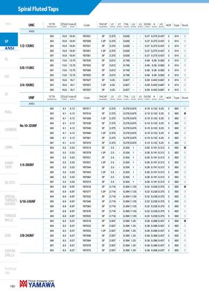 Spiral Fluted Taps Intro UNC TCTR Ø Hole Ø(tolerance)(mm)(mm)CodeTHCHT(chamfer)LF LT THL LU LS DCON K LK(inch)(inch)(inch)(inch)(inch)(inch)(inch)(inch)NOFTypeStock ANSI GH3 10.9 10.91 Y87521 3P 3.375 - 0.630 - - 0.37 0.275 0.437 3 014 f SP GH3 10.9 10.91 Y87500 1.5P 3.375 - 0.630 - - 0.37 0.275 0.437 3 014 f ANSI 1/2-13UNC GH5 10.9 10.91 Y87551 3P 3.375 - 0.630 - - 0.37 0.275 0.437 3 014 f GH5 10.9 10.91 Y87051 1.5P 3.375 - 0.630 - - 0.37 0.275 0.437 3 014 f GH7 10.9 10.91 Y87581 3P 3.375 - 0.630 - - 0.37 0.275 0.437 3 014 f SL GH3 13.6 13.75 Y87525 3P 3.812 - 0.748 - - 0.48 0.36 0.562 4 014 f GH5 13.6 13.75 Y87555 3P 3.812 - 0.748 - - 0.48 0.36 0.562 4 014 f 5/8-11UNC GH7 13.6 13.75 Y87585 3P 3.812 - 0.748 - - 0.48 0.36 0.562 4 014 f PO GH3 13.6 13.75 Y87025 3P 3.812 - 0.748 - - 0.48 0.36 0.562 4 014 f GH3 16.6 16.7 Y87527 3P 4.25 - 0.827 - - 0.59 0.442 0.687 4 014 f 3/4-10UNC GH3 16.6 16.7 Y87027 1.5P 4.25 - 0.827 - - 0.59 0.442 0.687 4 014 f GH5 16.6 16.7 Y87557 3P 4.25 - 0.827 - - 0.59 0.442 0.687 4 014 f ST UNF TCTR Ø Hole Ø(tolerance)(mm)(mm)CodeTHCHT(chamfer)LF LT THL LU LS DCON K LK(inch)(inch)(inch)(inch)(inch)(inch)(inch)(inch)NOFTypeStock ANSI GH2 4.1 4.12 Y87511 3P 2.375 - 0.276 0.875 - 0.19 0.152 0.25 3 002 f ROLL GH3 4.1 4.12 Y87510 3P 2.375 - 0.276 0.875 - 0.19 0.152 0.25 3 002 ) GH3 4.1 4.12 Y81556 1.5P 2.375 - 0.276 0.875 - 0.19 0.152 0.25 3 002 f GH4 4.1 4.12 Y87530 3P 2.375 - 0.276 0.875 - 0.19 0.152 0.25 3 002 f No.10-32UNF CARBIDE GH5 4.1 4.12 Y87540 3P 2.375 - 0.276 0.875 - 0.19 0.152 0.25 3 002 f GH5 4.1 4.12 Y87040 1.5P 2.375 - 0.276 0.875 - 0.19 0.152 0.25 3 002 f GH6 4.1 4.12 Y87561 3P 2.375 - 0.276 0.875 - 0.19 0.152 0.25 3 002 f GH7 4.1 4.12 Y87570 3P 2.375 - 0.276 0.875 - 0.19 0.152 0.25 3 002 f LONG GH3 5.5 5.53 Y87514 3P 2.5 - 0.354 1 - 0.26 0.191 0.312 3 002 ) GH3 5.5 5.53 Y87579 1.5P 2.5 - 0.354 1 - 0.26 0.191 0.312 3 002 f GH4 5.5 5.53 Y87531 3P 2.5 - 0.354 1 - 0.26 0.191 0.312 3 002 f HANDTAPS 1/4-28UNF GH4 5.5 5.53 Y87031 1.5P 2.5 - 0.354 1 - 0.26 0.191 0.312 3 002 fGH55.55.53Y875443P2.5-0.3541-0.260.1910.3123002f GH5 5.5 5.53 Y87443 1.5P 2.5 - 0.354 1 - 0.26 0.191 0.312 3 002 f GH6 5.5 5.53 Y87562 3P 2.5 - 0.354 1 - 0.26 0.191 0.312 3 002 f EG (STI) GH7 5.5 5.53 Y87574 3P 2.5 - 0.354 1 - 0.26 0.191 0.312 3 002 f GH3 6.9 6.97 Y87516 3P 2.718 - 0.394 1.125 - 0.32 0.238 0.375 3 002 ) GH3 6.9 6.97 Y87577 1.5P 2.718 - 0.394 1.125 - 0.32 0.238 0.375 3 002 f SPECIAL GH4 6.9 6.97 Y87532 3P 2.718 - 0.394 1.125 - 0.32 0.238 0.375 3 002 f THREADS,GAUGES5/16-24UNF GH5 6.9 6.97 Y87546 3P 2.718 - 0.394 1.125 - 0.32 0.238 0.375 3 002 f GH6 6.9 6.97 Y87563 3P 2.718 - 0.394 1.125 - 0.32 0.238 0.375 3 002 f GH7 6.9 6.97 Y87576 3P 2.718 - 0.394 1.125 - 0.32 0.238 0.375 3 002 f THREAD GH4 6.9 6.97 Y87032 3P 2.718 - 0.394 1.125 - 0.32 0.238 0.375 3 002 f MILLS GH3 8.5 8.57 Y87518 3P 2.937 - 0.394 1.25 - 0.38 0.286 0.437 3 002 ) GH4 8.5 8.57 Y87533 3P 2.937 - 0.394 1.25 - 0.38 0.286 0.437 3 002 f GH4 8.5 8.57 Y87033 1.5P 2.937 - 0.394 1.25 - 0.38 0.286 0.437 3 002 f DIES 3/8-24UNF GH5 8.5 8.57 Y87548 3P 2.937 - 0.394 1.25 - 0.38 0.286 0.437 3 002 f GH6 8.5 8.57 Y87564 3P 2.937 - 0.394 1.25 - 0.38 0.286 0.437 3 002 f GH7 8.5 8.57 Y87578 3P 2.937 - 0.394 1.25 - 0.38 0.286 0.437 3 002 f CENTER GH3 8.5 8.57 Y87575 3P 2.937 - 0.394 1.25 - 0.38 0.286 0.437 3 002 f DRILLS Technical info 190