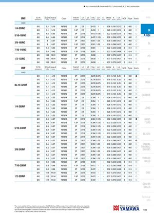 h stock standard, ) check stock EU, f check stock JP, m stock exhaustion UNC TCTR Ø Hole Ø(tolerance)(mm)(mm)CodeTHCHT(chamfer)LF LT THL LU LS DCON K LK(inch)(inch)(inch)(inch)(inch)(inch)(inch)(inch)NOFTypeStockIntro ANSI GH3 5.1 5.19 Y87613 3P 2.5 - 0.433 1 - 0.26 0.191 0.312 3 002 f 1/4-20UNC GH3 5.1 5.19 Y87628 1.5P 2.5 - 0.433 1 - 0.26 0.191 0.312 3 002 f SP 5/16-18UNC GH3 6.6 6.65 Y87615 3P 2.718 - 0.472 1.125 - 0.32 0.238 0.375 3 002 f ANSI GH3 6.6 6.65 Y87695 1.5P 2.718 - 0.472 1.125 - 0.32 0.238 0.375 3 002 f GH3 8 8.07 Y87617 3P 2.937 - 0.551 1.25 - 0.38 0.286 0.437 3 002 f 3/8-16UNC GH3 8 8.07 Y87611 1.5P 2.937 - 0.551 1.25 - 0.38 0.286 0.437 3 002 f SL GH3 9.4 9.45 Y87619 3P 3.156 - 0.591 - - 0.32 0.242 0.406 3 014 f 7/16-14UNC GH3 9.4 9.45 Y81629 1.5P 3.156 - 0.591 - - 0.32 0.242 0.406 3 014 f GH3 10.9 10.91 Y87621 3P 3.375 - 0.630 - - 0.37 0.275 0.437 3 014 f PO 1/2-13UNC GH3 10.9 10.91 Y87021 1.5P 3.375 - 0.630 - - 0.37 0.275 0.437 3 014 f GH5 10.9 10.91 Y87626 3P 3.375 - 0.630 - - 0.37 0.275 0.437 3 014 f UNF TCTR Ø Hole Ø(tolerance)(mm)(mm)CodeTHCHT(chamfer)LF LT THL LU LS DCON K LK(inch)(inch)(inch)(inch)(inch)(inch)(inch)(inch)NOFTypeStockST ANSI GH3 4.1 4.12 Y87610 3P 2.375 - 0.276 0.875 - 0.19 0.152 0.25 3 002 ) GH3 4.1 4.12 Y87010 1.5P 2.375 - 0.276 0.875 - 0.19 0.152 0.25 3 002 f GH4 4.1 4.12 Y87630 3P 2.375 - 0.276 0.875 - 0.19 0.152 0.25 3 002 f ROLL No.10-32UNF GH5 4.1 4.12 Y87640 3P 2.375 - 0.276 0.875 - 0.19 0.152 0.25 3 002 f GH6 4.1 4.12 Y87661 3P 2.375 - 0.276 0.875 - 0.19 0.152 0.25 3 002 f GH7 4.1 4.12 Y87670 3P 2.375 - 0.276 0.875 - 0.19 0.152 0.25 3 002 f CARBIDE GH3 5.5 5.53 Y87614 3P 2.5 - 0.354 1 - 0.26 0.191 0.312 3 002 ) GH3 5.5 5.53 Y87014 1.5P 2.5 - 0.354 1 - 0.26 0.191 0.312 3 002 f GH4 5.5 5.53 Y87631 3P 2.5 - 0.354 1 - 0.26 0.191 0.312 3 002 f 1/4-28UNF GH5 5.5 5.53 Y87644 3P 2.5 - 0.354 1 - 0.26 0.191 0.312 3 002 f LONG GH6 5.5 5.53 Y87662 3P 2.5 - 0.354 1 - 0.26 0.191 0.312 3 002 f GH7 5.5 5.53 Y87674 3P 2.5 - 0.354 1 - 0.26 0.191 0.312 3 002 f GH3 6.9 6.97 Y87616 3P 2.718 - 0.394 1.125 - 0.32 0.238 0.375 3 002 ) HAND GH3 6.9 6.97 Y87016 1.5P 2.718 - 0.394 1.125 - 0.32 0.238 0.375 3 002 f TAPS GH4 6.9 6.97 Y87632 3P 2.718 - 0.394 1.125 - 0.32 0.238 0.375 3 002 f 5/16-24UNF GH5 6.9 6.97 Y87646 3P 2.718 - 0.394 1.125 - 0.32 0.238 0.375 3 002 f GH6 6.9 6.97 Y87663 3P 2.718 - 0.394 1.125 - 0.32 0.238 0.375 3 002 f EG (STI) GH7 6.9 6.97 Y87676 3P 2.718 - 0.394 1.125 - 0.32 0.238 0.375 3 002 f GH3 8.5 8.57 Y87618 3P 2.937 - 0.394 1.25 - 0.38 0.286 0.437 3 002 ) GH4 8.5 8.57 Y87633 3P 2.937 - 0.394 1.25 - 0.38 0.286 0.437 3 002 f SPECIAL 3/8-24UNF GH5 8.5 8.57 Y87648 3P 2.937 - 0.394 1.25 - 0.38 0.286 0.437 3 002 f THREADS,GAUGES GH6 8.5 8.57 Y87664 3P 2.937 - 0.394 1.25 - 0.38 0.286 0.437 3 002 f GH7 8.5 8.57 Y87678 3P 2.937 - 0.394 1.25 - 0.38 0.286 0.437 3 002 f GH3 8.5 8.57 Y87018 1.5P 2.937 - 0.394 1.25 - 0.38 0.286 0.437 3 002 f THREAD GH3 9.9 9.96 Y87620 3P 3.156 - 0.472 - - 0.32 0.242 0.406 3 014 f MILLS 7/16-20UNF GH3 9.9 9.96 Y87020 1.5P 3.156 - 0.472 - - 0.32 0.242 0.406 3 014 f GH5 9.9 9.96 Y87650 3P 3.156 - 0.472 - - 0.32 0.242 0.406 3 014 f GH3 11.5 11.54 Y87622 3P 3.375 - 0.472 - - 0.37 0.275 0.437 3 014 f DIES 1/2-20UNF GH3 11.5 11.54 Y87023 1.5P 3.375 - 0.472 - - 0.37 0.275 0.437 3 014 f GH5 11.5 11.54 Y87652 3P 3.375 - 0.472 - - 0.37 0.275 0.437 3 014 f CENTER DRILLS Technical info The most suitable GH tap class to cut accurate 2B, 3B (UNJ) and 2B oversized internal threads tolerance, depends on application conditions and work-piece materials. Yamawa GH class system offers a wide range of alternative tap classes allowing each customer to select the most suitable one according to application requirement. 193 Check page 673 of Technical info for full details.