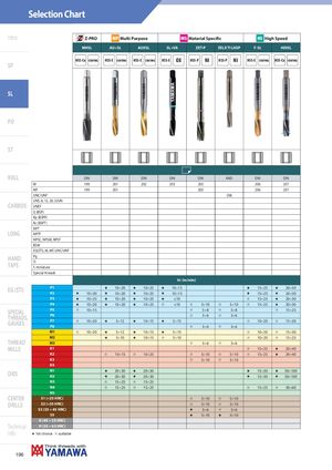 Selection Chart Intro Z-PRO MP Multi Purpose MS Material Specific HS High Speed MHSL AU+SL AUXSL SL+VA ZET-P ZELX TI LHSP F-SL HDISL HSS-Co COATING HSS-E COATING HSS-E COATING HSS-E OX HSS-P NI HSS-P NI HSS-E COATING HSS-Co COATING SP SL PO ST ROLL DIN DIN DIN DIN DIN ANSI DIN DIN M 199 201 202 203 205 206 207 MF 199 201 205 206 207 UNC/UNF 208 UNS, 8, 12, 20, 32UN CARBIDE UNEF G (BSP) Rp (BSPP) Rc (BSPT) NPT LONG NPTF NPSC, NPSM, NPSF BSW EG(STI), M, MF, UNC/UNF HAND Pg TAPS TrS miniature Special threads Vc (m/min) EG (STI) P1 H 10÷20 H 10÷25 H 10÷15P2H10÷30H10÷20H10÷25H10÷15 H 15÷25 H 20÷50H15÷25H20÷50 P3 H 10÷25 H 10÷20 H 10÷25 H ≤10 I 15÷25 H 20÷30 P4 H 10÷20 H 10÷20 H 10÷25 I ≤10 I 5÷10 I 5÷10 I 15÷25 H 20÷30 SPECIALTHREADS,GAUGES P5P6P7P8 I 10÷15 I 5÷8 I 5÷8 I 15÷25I3÷6I3÷6I10÷20H5÷12H10÷15H5÷15I10÷20I15÷30I3÷6I3÷6 M1 I 10÷20 H 5÷12 H 10÷15 H 5÷15 I 10÷20 I 15÷30 M2 H 5÷10 H 10÷15 I 5÷10 I 10÷20 I 15÷25 THREAD M3 I 3÷6 I 3÷6 MILLS K1 I 15÷25 H 20÷40 K2 I 10÷15 I 10÷25 I 5÷10 I 5÷10 I 15÷25 H 20÷40 K3 I 5÷10 I 5÷10 K4 DIES N1N2 H 20÷30 H 20÷30H20÷30H20÷30 H 15÷30 H 30÷100H15÷30H30÷100 N3 I 15÷25 I 15÷25 N4 I 15÷25 I 15÷25 I 15÷25 I 30÷60 N5 CENTER S1 (<25 HRC) I 5÷10 I 5÷10 DRILLS S2 (<35 HRC) I 5÷10 I 5÷10 S3 (35 ÷ 45 HRC) H 3÷6 I 3÷6 S5 H 5÷10 H 5÷10 H (45 ÷ 55 HRC) Technical H (55 ÷ 63 HRC) info H 1st choice I suitable 196