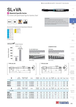 Number of threads h stock standard, ) check stock EU, f check stock JP, m stock exhaustion SL+VA Intro MS Material Specific Series Plus Series Left Spiral Fluted Taps for Stainless Steel SP FEATURES HSS-E OX 5PTHCHT Material specific for through hole application.Most suitable for stainless steel, steel and alloy steel. SLOX treatment reduces welding troubles and left handhelix imrpoves chip ejection.DIN Recommended Tapping Speeds Depending On Materials PO ISO Vc (m/min) ISO Vc (m/min) P1 10÷15 H M1 5÷15 H P2 10÷15 H M2 5÷10 I P3 ≤10 H ST P4 ≤10 I P7 5÷15 H H 1st choice I suitable ROLL DIN-SL+VA Product Features AISI 304 - 1.4301 COMPETITOR CARBIDE SL+VA (still working) SL+VA 2000 holes 700 holes internal thread shape internal thread shape LONG Competitor HAND Worn out tap Worn out tap TAPS TYPE: EU_057 TYPE: EU_090 DCON K DCON K EG (STI) THL LU LKLS K THL LU LKLS K SPECIAL LF LF THREADS, GAUGES M TCTR Ø Hole Ø(tolerance)(mm)(mm)CodeTHCHT(chamfer)LF(mm)THL(mm) LU(mm)LS DCON K(mm)(mm)(mm)LK(mm)NOFType Stock THREADMILLS DIN 371 M3X0.5 ISO2X(6HX) 2.5 2.56 LE3.0GBGEX 5P 56 9 18 34 3.5 2.7 6 3 057 h M4X0.7 ISO2X(6HX) 3.3 3.38 LE4.0IBGEX 5P 63 13 21 38 4.5 3.4 6 3 057 h M5X0.8 ISO2X(6HX) 4.2 4.28 LE5.0KBGEX 5P 70 14 25 39 6 4.9 8 3 057 h DIES M TCTR Ø Hole Ø(tolerance)(mm)(mm)CodeTHCHT(chamfer)LF(mm)THL(mm) LU(mm)LS DCON K(mm)(mm)(mm)LK(mm)NOFType Stock DIN YMW CENTER M6X1 ISO2X(6HX) 5 5.09 LZ6.0MBGEX 5P 80 15 30 45 6 4.9 8 3 090 h DRILLS M8X1.25 ISO2X(6HX) 6.8 6.85 LZ8.0NBGEX 5P 90 19 35 48 8 6.2 9 3 090 h M10X1.5 ISO2X(6HX) 8.5 8.6 LZ010OBGEX 5P 100 23 39 53 10 8 11 3 090 h M12X1.75 ISO2X(6HX) 10.3 10.36 LZ012PBGEX 5P 110 26 45 56 12 9 12 3 090 h Technicalinfo 203