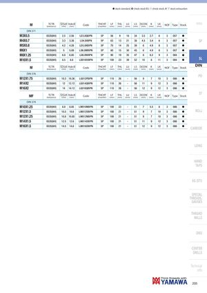 h stock standard, ) check stock EU, f check stock JP, m stock exhaustion M TCTR Ø Hole Ø(tolerance)(mm)(mm)CodeTHCHT(chamfer)LF(mm)THL(mm) LU(mm) LS DCON K(mm)(mm)(mm)LK(mm)NOFTypeStock Intro DIN 371 M3X0.5 ISO2X(6HX) 2.5 2.56 LD3.0GBIPN 5P 56 9 18 34 3.5 2.7 6 3 057 h M4X0.7 ISO2X(6HX) 3.3 3.38 LD4.0IBIPN 5P 63 13 21 38 4.5 3.4 6 3 057 h SP M5X0.8 ISO2X(6HX) 4.2 4.28 LD5.0KBIPN 5P 70 14 25 39 6 4.9 8 3 057 h M6X1 ISO2X(6HX) 5 5.09 LD6.0MBIPN 5P 80 15 30 45 6 4.9 8 3 057 h M8X1.25 ISO2X(6HX) 6.8 6.85 LD8.0NBIPN 5P 90 19 35 47 8 6.2 9 3 084 h M10X1.5 ISO2X(6HX) 8.5 8.6 LD010OBIPN 5P 100 23 39 52 10 8 11 3 084 h SL M TCTR Ø Hole Ø(tolerance)(mm)(mm)CodeTHCHT(chamfer)LF(mm)THL(mm) LU(mm) LS DCON K(mm)(mm)(mm)LK(mm)NOFTypeStock DIN DIN 376 PO M12X1.75 ISO2X(6HX) 10.3 10.36 LG012PBIPN 5P 110 26 - 56 9 7 10 3 086 h M14X2 ISO2X(6HX) 12 12.12 LG014QBIPN 5P 110 26 - 56 11 9 12 3 086 h M16X2 ISO2X(6HX) 14 14.12 LG016QBIPN 5P 110 26 - 56 12 9 12 3 086 h MF TCTR Ø Hole Ø(tolerance)(mm)(mm)CodeTHCHT(chamfer)LF(mm)THL(mm) LU(mm) LS DCON K(mm)(mm)(mm)LK(mm)NOFTypeStock ST DIN 374 M10X1.25 ISO2X(6HX) 8.8 8.85 LM010NBIPN 5P 100 23 - 51 7 5.5 8 3 086 h M12X1.5 ISO2X(6HX) 10.5 10.6 LM012OBIPN 5P 100 21 - 51 9 7 10 3 086 h ROLL M12X1.25 ISO2X(6HX) 10.8 10.85 LM012NBIPN 5P 100 21 - 51 9 7 10 3 086 h M14X1.5 ISO2X(6HX) 12.5 12.6 LM014OBIPN 5P 100 21 - 51 11 9 12 3 086 h M16X1.5 ISO2X(6HX) 14.5 14.6 LM016OBIPN 5P 100 21 - 51 12 9 12 3 086 h CARBIDE LONG HAND TAPS EG (STI) SPECIAL THREADS, GAUGES THREAD MILLS DIES CENTER DRILLS Technical info 205