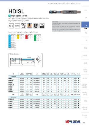 h stock standard, ) check stock EU, f check stock JP, m stock exhaustion HDISL Intro HS High Speed Series Left Spiral Fluted Taps with Radial Coolant Holes for Ultra SP High Speed Tapping, Coated FEATURES HSS-Co COATING SYNCHRO 5P Ultra High Speed with radial coolant holes for throughhole application SLTHCHTMost suitable for steel, can be used even on stainlesssteel, cast iron and non-ferrous materials.DIN For Synchro-rigid tapping system. Left hand spiral allows smooth chip ejection. Recommended Tapping Speeds Depending On Materials PO ISO Vc (m/min) ISO Vc (m/min) ISO Vc (m/min) ISO Vc (m/min) P1 20÷50 H M1 15÷30 I K1 20÷40 H N1 30÷100 H P2 20÷50 H M2 15÷25 I K2 20÷40 H N2 30÷100 H P3 20÷30 H N4 30÷60 I ST P4 20÷30 H P5 15÷25 I P7 15÷30 I ROLL H 1st choice I suitable DIN-HDISL TYPE: EU_104-2 K CARBIDE DCON THL LK LU LS K LONG LF HAND TAPS M TCTR Ø Hole Ø(tolerance)(mm)(mm)CodeTHCHT(chamfer)LF(mm)THL(mm) LU(mm) LS DCON K(mm)(mm)(mm)LK(mm)NOFType Stock DIN YMW M6X1 ISO2X(6HX) 5 5.09 LY6.0MBEDTLZ 5P 80 15 30 45 6 4.9 8 3 104-2 h EG (STI) M8X1.25 ISO2X(6HX) 6.8 6.85 LY8.0NBEDTLZ 5P 90 19 35 48 8 6.2 9 3 104-2 h M10X1.5 ISO2X(6HX) 8.5 8.6 LY010OBEDTLZ 5P 100 23 39 53 10 8 11 3 104-2 h M12X1.75M14X2 ISO2X(6HX) 10.3 10.36 LY012PBEDTLZ 5P 110 26 44 57 12 9 12 3 104-2 h SPECIALTHREADS,ISO2X(6HX)1212.12TCYLZ0045P11026-62129123104-2hGAUGES M16X2 ISO2X(6HX) 14 14.12 SFYLZ005 5P 110 26 - 58 16 12 15 3 104-2 h M20X2.5 ISO2X(6HX) 17.5 17.63 UJYLZ004 5P 140 33 - 80 16 12 15 4 104-2 h THREAD MF TCTR Ø Hole Ø(tolerance)(mm)(mm)CodeTHCHT(chamfer)LF(mm)THL(mm) LU(mm) LS DCON K(mm)(mm)(mm)LK(mm)NOFType Stock MILLS DIN YMW M10X1.25 ISO2X(6HX) 8.8 8.85 LY010NBEDTLZ 5P 100 23 39 53 10 8 11 3 104-2 h M12X1.5 ISO2X(6HX) 10.5 10.6 LY012OBEDTLZ 5P 110 26 44 57 12 9 12 3 104-2 h DIES M12X1.25 ISO2X(6HX) 10.8 10.85 LY012NBEDTLZ 5P 110 26 44 57 12 9 12 3 104-2 h M14X1.5 ISO2X(6HX) 12.5 12.6 SFYLZ006 5P 110 26 - 62 12 9 12 3 104-2 h M16X1.5 ISO2X(6HX) 14.5 14.6 UJYLZ003 5P 110 26 - 58 16 12 15 3 104-2 h CENTER DRILLS Technical info 207
