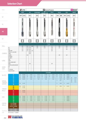 Selection Chart Intro Z-PRO GP General Purpose MS Material Specific VUPO PO PO ISO3(6G) POISO2(6H)+100PO LH PO OX PO V PM-PO HSS-P COATING HSS-E HSS-E HSS-E HSS-E HSS-E OX HSS-E COATING HSS-P SP SL PO ST ROLL DIN DIN JIS ANSI DIN DIN JIS DIN DIN DIN M 215 219 239 219 219 246 225 227 229 MF 215 220 240 247 227 229 UNC/UNF 216 221 243 253 247 UNS, 8, 12, 20, 32UN 244 CARBIDE UNEF 244 G (BSP) 222 225 227 Rp (BSPP) Rc (BSPT) NPT LONG NPTF NPSC, NPSM, NPSF BSW 245 247 EG(STI), M, MF, UNC/UNF HAND Pg TAPS TrS miniature Special threads Vc (m/min) EG (STI) P1 H 10÷30 I 5÷10 I 5÷10 I 5÷10 I 5÷10 H 5÷10 H 10÷20P2H10÷30H5÷10H5÷10H5÷10H5÷10H5÷10H10÷20 P3 H 10÷30 I 5÷10 I 5÷10 I 5÷10 I 5÷10 I 5÷10 H 10÷20 H 2÷10 P4 H 10÷25 I 5÷8 I 5÷8 I 5÷8 I 5÷8 I 5÷8 H 10÷15 H 2÷7 SPECIALTHREADS,GAUGES P5P6P7P8 H 5÷15 I 4÷7 H 2÷7H2÷5I4÷8I6÷12 M1 H 5÷15 I 4÷8 I 6÷12 M2 I 5÷10 THREAD M3 MILLS K1 I 10÷20 K2 I 10÷20 K3 K4 DIES N1 H 10÷40 I 5÷10 I 5÷10 I 5÷10 I 5÷10N2H10÷40I5÷10I5÷10I5÷10I5÷10I10÷20I10÷20 N3 I 10÷25 I 5÷10 I 5÷10 I 5÷10 I 5÷10 I 10÷20 N4 I 10÷20 I 5÷10 I 5÷10 I 5÷10 I 5÷10 I 10÷20 N5 CENTER S1 (<25 HRC) DRILLS S2 (<35 HRC) S3 (35 ÷ 45 HRC) S5 H (45 ÷ 55 HRC) Technical H (55 ÷ 63 HRC) info H 1st choice I suitable 212