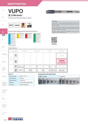 EmulsionOil Spiral Pointed Taps Intro VUPO Z-PRO Series SP HSSP Spiral Pointed Taps, Coated FEATURES SL HSS-P COATING 5P Longer Life - Great improvement thanks to the newpremium grade of powder high speed steel and newspecial coating. THCHT New Flute Shape - Improved chip ejection, reduced cutting resistance and excellent internal threads finishing thanks to unique flute shape. PO Recommended Tapping Speeds Depending On Materials For wide range of workpiece materials: steel, alloy steel,stainless steel and aluminium. ISO Vc (m/min) ISO Vc (m/min) ISO Vc (m/min) ISO Vc (m/min) DIN P1 10÷30 H M1 5÷15 H K1 10÷20 I N1 10÷40 H P2 10÷30 H M2 5÷10 I K2 10÷20 I N2 10÷40 H ST P3 10÷30 H N3 10÷25 I P4 10÷25 H N4 10÷20 I P7 5÷15 H WATCH THE VIDEO H 1st choice I suitable ROLL Product Features DIN-VUPO Lubricant Holeshape Hand tapping Drilling machine Low speed Middle speed CARBIDE VUSP LONG VUPO Vc ≤ 30 m/min HAND HTset ISP SP SP V AU+SP TAPS IHT IPO PO PO V AU+SL M10×1.5 Enlarged photo after 560 threads EG (STI) Work-material Ck50 - 1.1213 VUPO - no wear Competitor Thread length 20 mm Tapping speed 20 m/min SPECIAL Machine Vertical machining center THREADS,GAUGESLubricant Water soluble oil THREAD MILLS DIES CENTER DRILLS Technical info 214