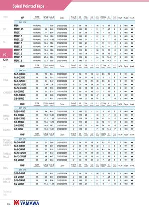 Spiral Pointed Taps Intro MF TCTR Ø Hole Ø(tolerance)(mm)(mm)CodeTHCHT(chamfer)LF(mm)THL(mm) LU(mm) LS DCON K(mm)(mm)(mm)LK(mm)NOFTypeStock DIN 374 M8X1 ISO2X(6HX) 7 7.09 3102101065 5P 90 19 - 46 6 4.9 8 3 003 h SP M10X1.25 ISO2X(6HX) 8.8 8.85 3102101079 5P 100 23 - 51 7 5.5 8 3 003 h M10X1 ISO2X(6HX) 9 9.09 3102101080 5P 90 19 - 46 7 5.5 8 3 003 h M12X1.5 ISO2X(6HX) 10.5 10.6 3102101089 5P 100 21 - 51 9 7 10 3 003 h M12X1.25 ISO2X(6HX) 10.8 10.85 3102101090 5P 100 21 - 51 9 7 10 3 003 h SL M14X1.5 ISO2X(6HX) 12.5 12.6 3102101102 5P 100 21 - 51 11 9 12 3 003 h M16X1.5 ISO2X(6HX) 14.5 14.6 3102101116 5P 100 21 - 51 12 9 12 3 003 h M18X1.5 ISO2X(6HX) 16.5 16.6 3102101130 5P 110 24 - 56 14 11 14 3 003 h PO M20X1.5 ISO2X(6HX) 18.5 18.6 3102101144 5P 125 24 - 64 16 12 15 3 003 h M22X1.5 ISO2X(6HX) 20.5 20.6 3102101158 5P 125 24 - 64 18 14.5 17 3 003 h DIN M24X1.5 ISO2X(6HX) 22.5 22.6 3102101170 5P 140 27 - 71 18 14.5 17 3 003 h ST UNC TCTR Ø Hole Ø(tolerance)(mm)(mm)CodeTHCHT(chamfer)LF(mm)THL(mm) LU(mm) LS DCON K(mm)(mm)(mm)LK(mm)NOFTypeStock DIN 371 No.5-40UNC 2BX 2.6 2.64 3102103021 5P 56 11 18 34 3.5 2.7 6 2 001 h No.6-32UNC 2BX 2.8 2.83 3102103023 5P 56 11 19 32 4 3 6 2 001 h ROLL No.8-32UNC 2BX 3.4 3.47 3102103029 5P 63 13 21 38 4.5 3.4 6 2 001 h No.10-24UNC 2BX 3.89 3.9 3102103039 5P 70 14 24 39 6 4.9 8 2 001 h No.12-24UNC 2BX 4.5 4.53 3102103047 5P 80 15 28 45 6 4.9 8 3 001 h CARBIDE 1/4-20UNC 2BX 5.1 5.19 3102103058 5P 80 15 30 42 7 5.5 8 3 001 h 5/16-18UNC 2BX 6.6 6.65 3102103071 5P 90 19 35 47 8 6.2 9 3 002 h 3/8-16UNC 2BX 8 8.07 3102103082 5P 100 23 39 54 9 7 10 3 002 h LONG UNC TCTR Ø Hole Ø(tolerance)(mm)(mm)CodeTHCHT(chamfer)LF(mm)THL(mm) LU(mm) LS DCON K(mm)(mm)(mm)LK(mm)NOFTypeStock DIN 376 7/16-14UNC 2BX 9.4 9.45 3102103098 5P 100 23 - 51 8 6.2 9 3 003 h HAND 1/2-13UNC 2BX 10.9 10.91 3102103111 5P 110 26 - 56 9 7 10 3 003 h TAPS 9/16-12UNC 2BX 12.2 12.33 3102103126 5P 110 26 - 56 11 9 12 3 003 h 5/8-11UNC 2BX 13.6 13.75 3102103138 5P 110 26 - 56 12 9 12 3 003 h 3/4-10UNC 2BX 16.6 16.7 3102103161 5P 125 33 - 64 14 11 14 3 003 h EG (STI) 7/8-9UNC 2BX 19.6 19.61 3102103181 5P 140 33 - 71 18 14.5 17 3 003 h UNF TCTR Ø Hole Ø(tolerance)(mm)(mm)CodeTHCHT(chamfer)LF(mm)THL(mm) LU(mm) LS DCON K(mm)(mm)(mm)LK(mm)NOFTypeStock SPECIAL DIN 371 THREADS, No.5-44UNF 2BX 2.7 2.69 3102103022 5P 56 11 18 34 3.5 2.7 6 2 001 h GAUGES No.6-40UNF 2BX 2.9 2.97 3102103024 5P 56 11 19 32 4 3 6 2 001 h No.8-36UNF 2BX 3.5 3.55 3102103030 5P 63 13 21 38 4.5 3.4 6 2 001 h THREAD No.10-32UNF 2BX 4.1 4.12 3102103041 5P 70 14 24 39 6 4.9 8 2 001 h MILLS No.12-28UNF 2BX 4.6 4.67 3102103048 5P 80 15 28 45 6 4.9 8 3 001 h 1/4-28UNF 2BX 5.5 5.53 3102103062 5P 80 15 30 42 7 5.5 8 3 001 h DIES UNF TCTR Ø Hole Ø(tolerance)(mm)(mm)CodeTHCHT(chamfer)LF(mm)THL(mm) LU(mm) LS DCON K(mm)(mm)(mm)LK(mm)NOFTypeStock DIN 374 5/16-24UNF 2BX 6.9 6.97 3102103074 5P 90 19 - 46 6 4.9 8 3 003 h 3/8-24UNF 2BX 8.5 8.57 3102103085 5P 100 23 - 51 7 5.5 8 3 003 h CENTERDRILLS7/16-20UNF 2BX 9.9 9.96 3102103101 5P 100 23 - 51 8 6.2 9 3 003 h 1/2-20UNF 2BX 11.5 11.54 3102103115 5P 100 21 - 51 9 7 10 3 003 h Technical info 216