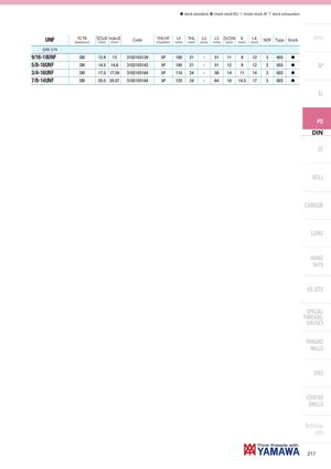 h stock standard, ) check stock EU, f check stock JP, m stock exhaustion UNF TCTR Ø Hole Ø(tolerance)(mm)(mm)CodeTHCHT(chamfer)LF(mm)THL(mm) LU(mm) LS DCON K(mm)(mm)(mm)LK(mm)NOFTypeStock Intro DIN 374 9/16-18UNF 2BX 12.9 13 3102103129 5P 100 21 - 51 11 9 12 3 003 h 5/8-18UNF 2BX 14.5 14.6 3102103142 5P 100 21 - 51 12 9 12 3 003 h SP 3/4-16UNF 2BX 17.5 17.59 3102103164 5P 110 24 - 56 14 11 14 3 003 h 7/8-14UNF 2BX 20.5 20.57 3102103184 5P 125 24 - 64 18 14.5 17 3 003 h SL PO DIN ST ROLL CARBIDE LONG HAND TAPS EG (STI) SPECIAL THREADS, GAUGES THREAD MILLS DIES CENTER DRILLS Technical info 217