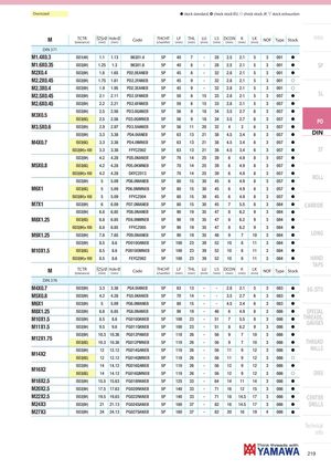 Oversized h stock standard, ) check stock EU, f check stock JP, m stock exhaustion M TCTR Ø Hole Ø(tolerance)(mm)(mm)CodeTHCHT(chamfer)LF(mm)THL(mm) LU(mm) LS DCON K(mm)(mm)(mm)LK(mm)NOFTypeStock Intro DIN 371 M1.4X0.3 ISO1(4H) 1.1 1.13 96301.4 5P 40 7 - 28 2.5 2.1 5 3 001 h M1.6X0.35 ISO2(6H) 1.25 1.3 96301.6 5P 40 8 - 28 2.5 2.1 5 3 001 h SP M2X0.4 ISO2(6H) 1.6 1.65 PD2.0EANEB 5P 45 8 - 32 2.8 2.1 5 3 001 h M2.2X0.45 ISO2(6H) 1.75 1.81 PD2.2FANEB 5P 45 9 - 32 2.8 2.1 5 3 001 f M2.3X0.4 ISO2(6H) 1.9 1.95 PD2.3EANEB 5P 45 9 - 32 2.8 2.1 5 3 001 f M2.5X0.45 ISO2(6H) 2.1 2.11 PD2.5FANEB 5P 50 8 15 33 2.8 2.1 5 3 057 h SL M2.6X0.45 ISO2(6H) 2.2 2.21 PD2.6FANEB 5P 50 8 15 33 2.8 2.1 5 3 057 h ISO2(6H) 2.5 2.56 PD3.0GANEB 5P 56 9 18 34 3.5 2.7 6 3 057 h M3X0.5 ISO3(6G) 2.5 2.56 PD3.0GMNEB 5P 56 9 18 34 3.5 2.7 6 3 057 h PO M3.5X0.6 ISO2(6H) 2.9 2.97 PD3.5HANEB 5P 56 11 20 32 4 3 6 3 057 h ISO2(6H) 3.3 3.38 PD4.0IANEB 5P 63 13 21 38 4.5 3.4 6 3 057 h DIN M4X0.7 ISO3(6G) 3.3 3.38 PD4.0IMNEB 5P 63 13 21 38 4.5 3.4 6 3 057 h ISO2(6H)+100 3.3 3.38 FFYCZ002 5P 63 13 21 38 4.5 3.4 6 3 057 h ST ISO2(6H) 4.2 4.28 PD5.0KANEB 5P 70 14 25 39 6 4.9 8 3 057 h M5X0.8 ISO3(6G) 4.2 4.28 PD5.0KMNEB 5P 70 14 25 39 6 4.9 8 3 057 h ISO2(6H)+100 4.2 4.28 SKYCZ013 5P 70 14 25 39 6 4.9 8 3 057 h ISO2(6H) 5 5.09 PD6.0MANEB 5P 80 15 30 45 6 4.9 8 3 057 h ROLL M6X1 ISO3(6G) 5 5.09 PD6.0MMNEB 5P 80 15 30 45 6 4.9 8 3 057 h ISO2(6H)+100 5 5.09 FFYCZ004 5P 80 15 30 45 6 4.9 8 3 057 h M7X1 ISO2(6H) 6 6.09 PD7.0MANEB 5P 80 15 30 45 7 5.5 8 3 084 h CARBIDE ISO2(6H) 6.8 6.85 PD8.0NANEB 5P 90 19 35 47 8 6.2 9 3 084 h M8X1.25 ISO3(6G) 6.8 6.85 PD8.0NMNEB 5P 90 19 35 47 8 6.2 9 3 084 h ISO2(6H)+100 6.8 6.85 FFYCZ005 5P 90 19 35 47 8 6.2 9 3 084 h M9X1.25 ISO2(6H) 7.8 7.85 PD9.0NANEB 5P 90 19 35 48 9 7 10 3 084 h LONG ISO2(6H) 8.5 8.6 PD010OANEB 5P 100 23 39 52 10 8 11 3 084 h M10X1.5 ISO3(6G) 8.5 8.6 PD010OMNEB 5P 100 23 39 52 10 8 11 3 084 h ISO2(6H)+100 8.5 8.6 FEYCZ002 5P 100 23 39 52 10 8 11 3 084 h HAND TAPS M TCTR Ø Hole Ø(tolerance)(mm)(mm)CodeTHCHT(chamfer)LF(mm)THL(mm) LU(mm) LS DCON K(mm)(mm)(mm)LK(mm)NOFTypeStock DIN 376 M4X0.7 ISO2(6H) 3.3 3.38 PG4.0IANEB 5P 63 13 - - 2.8 2.1 5 3 083 h EG (STI) M5X0.8 ISO2(6H) 4.2 4.28 PG5.0KANEB 5P 70 14 - - 3.5 2.7 6 3 083 h M6X1 ISO2(6H) 5 5.09 PG6.0MANEB 5P 80 15 - - 4.5 3.4 6 3 083 h M8X1.25 ISO2(6H) 6.8 6.85 PG8.0NANEB 5P 90 19 - 46 6 4.9 8 3 086 h SPECIAL M10X1.5 ISO2(6H) 8.5 8.6 PG010OANEB 5P 100 23 - 51 7 5.5 8 3 086 h THREADS,GAUGES M11X1.5 ISO2(6H) 9.5 9.6 PG011OANEB 5P 100 23 - 51 8 6.2 9 3 086 h ISO2(6H) 10.3 10.36 PG012PANEB 5P 110 26 - 56 9 7 10 3 086 h M12X1.75 ISO3(6G) 10.3 10.36 PG012PMNEB 5P 110 26 - 56 9 7 10 3 086 h THREAD ISO2(6H) 12 12.12 PG014QANEB 5P 110 26 - 56 11 9 12 3 086 h MILLS M14X2 ISO3(6G) 12 12.12 PG014QMNEB 5P 110 26 - 56 11 9 12 3 086 f ISO2(6H) 14 14.12 PG016QANEB 5P 110 26 - 56 12 9 12 3 086 h M16X2 ISO3(6G) 14 14.12 PG016QMNEB 5P 110 26 - 56 12 9 12 3 086 f DIES M18X2.5 ISO2(6H) 15.5 15.63 PG018RANEB 5P 125 33 - 64 14 11 14 3 086 h M20X2.5 ISO2(6H) 17.5 17.63 PG020RANEB 5P 140 33 - 71 16 12 15 3 086 h M22X2.5 ISO2(6H) 19.5 19.63 PG022RANEB 5P 140 33 - 71 18 14.5 17 3 086 h CENTER M24X3 ISO2(6H) 21 21.13 PG024SANEB 5P 160 37 - 82 18 14.5 17 3 086 h DRILLS M27X3 ISO2(6H) 24 24.13 PG027SANEB 5P 160 37 - 82 20 16 19 4 086 h Technical info 219