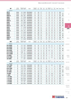 h stock standard, ) check stock EU, f check stock JP, m stock exhaustion MF TCTR Ø Hole Ø(tolerance)(mm)(mm)CodeTHCHT(chamfer)LF(mm)THL(mm) LU(mm) LS DCON K(mm)(mm)(mm)LK(mm)NOFTypeStock Intro DIN 374 M27X1 ISO2(6H) 26 26.09 PM027MANEB 5P 140 27 - 71 20 16 19 4 086 f M28X2 ISO2(6H) 26 26.12 PM028QANEB 5P 140 27 - 71 20 16 19 4 086 h SP M28X1.5 ISO2(6H) 26.5 26.6 PM028OANEB 5P 140 27 - 71 20 16 19 4 086 h M28X1 ISO2(6H) 27 27.09 PM028MANEB 5P 140 27 - 71 20 16 19 4 086 f M30X2 ISO2(6H) 28 28.12 PM030QANEB 5P 150 27 - 77 22 18 21 4 086 h M30X1.5 ISO2(6H) 28.5 28.6 PM030OANEB 5P 150 27 - 77 22 18 21 4 086 h SL M30X1 ISO2(6H) 29 29.09 PM030MANEB 5P 150 27 - 77 22 18 21 4 086 h M32X2 ISO2(6H) 30 30.12 PM032QANEB 5P 150 27 - 77 22 18 21 4 086 h M32X1.5 ISO2(6H) 30.5 30.6 PM032OANEB 5P 150 27 - 77 22 18 21 4 086 h PO M32X1 ISO2(6H) 31 31.09 PM032MANEB 5P 150 27 - 77 22 18 21 4 086 f M33X2 ISO2(6H) 31 31.12 PM033QANEB 5P 160 29 - 82 25 20 23 4 086 h DIN M33X1.5 ISO2(6H) 31.5 31.6 PM033OANEB 5P 160 29 - 82 25 20 23 4 086 h M33X1 ISO2(6H) 32 32.09 PM033MANEB 5P 160 29 - 82 25 20 23 4 086 f ST M36X3 ISO2(6H) 33 33.13 PM036SANEB 5P 200 52 - 102 28 22 25 4 086 h M36X2 ISO2(6H) 34 34.12 PM036QANEB 5P 170 29 - 87 28 22 25 4 086 h M36X1.5M36X1 ISO2(6H) 34.5 34.6 PM036OANEB 5P 170 29 - 87 28 22 25 4 086 hISO2(6H)3535.09PM036MANEB5P17029-872822254086fROLL UNC TCTR Ø Hole Ø(tolerance)(mm)(mm)CodeTHCHT(chamfer)LF(mm)THL(mm) LU(mm) LS DCON K(mm)(mm)(mm)LK(mm)NOFTypeStock DIN 371 CARBIDE No.4-40UNC 2B 2.3 2.33 PDUN4HXNEB 5P 56 9 18 34 3.5 2.7 6 3 057 h No.5-40UNC 2B 2.6 2.64 PDUN5HXNEB 5P 56 11 18 34 3.5 2.7 6 3 057 f No.6-32UNC 2B 2.8 2.83 PDUN6JXNEB 5P 56 11 19 32 4 3 6 3 057 h No.8-32UNC 2B 3.4 3.47 PDUN8JXNEB 5P 63 13 21 38 4.5 3.4 6 3 057 h LONG No.10-24UNC 2B 3.89 3.9 PDUNAMXNEB 5P 70 14 24 39 6 4.9 8 3 057 f No.12-24UNC 2B 4.5 4.53 PDUNCMXNEB 5P 80 15 28 45 6 4.9 8 3 057 f 1/4-20UNC 2B 5.1 5.19 PDU04NXNEB 5P 80 15 30 42 7 5.5 8 3 057 h HAND 5/16-18UNC 2B 6.6 6.65 PDU05OXNEB 5P 90 19 35 47 8 6.2 9 3 084 h TAPS 3/8-16UNC 2B 8 8.07 PDU06PXNEB 5P 100 23 39 52 9 7 10 3 084 h UNC TCTR Ø Hole Ø(tolerance)(mm)(mm)CodeTHCHT(chamfer)LF(mm)THL(mm) LU(mm) LS DCON K(mm)(mm)(mm)LK(mm)NOFTypeStock EG (STI) DIN 376 7/16-14UNC 2B 9.4 9.45 PGU07QXNEB 5P 100 23 - 51 8 6.2 9 3 086 f 1/2-13UNC 2B 10.9 10.91 PGU08RXNEB 5P 110 26 - 56 9 7 10 3 086 h SPECIAL 9/16-12UNC 2B 12.2 12.33 PGU09SXNEB 5P 110 26 - 56 11 9 12 3 086 f THREADS, 5/8-11UNC 2B 13.6 13.75 PGU10UXNEB 5P 110 26 - 56 12 9 12 3 086 h GAUGES 3/4-10UNC 2B 16.6 16.7 PGU12VXNEB 5P 125 33 - 64 14 11 14 3 086 h 7/8-9UNC 2B 19.6 19.61 PGU14WXNEB 5P 140 33 - 71 18 14.5 17 3 086 f THREAD 1 -8UNC 2B 22.3 22.45 PGU16XXNEB 5P 160 37 - 82 18 14.5 17 3 086 h MILLS 1 1/8-7UNC 2B 25 25.17 PGU18YXNEB 5P 180 44 - 92 22 18 21 4 086 f 1 1/4-7UNC 2B 28.2 28.35 PGU20YXNEB 5P 180 44 - 92 22 18 21 4 086 f 1 3/8-6UNC 2B 30.8 30.92 PGU22ZXNEB 5P 200 52 - 102 28 20 23 4 086 f DIES 1 1/2-6UNC 2B 34 34.1 PGU24ZXNEB 5P 200 52 - 102 32 24 27 4 086 f 1 3/4-5UNC 2B 39.5 39.61 PGU287XNEB 5P 220 66 - 112 36 29 32 4 086 f CENTER DRILLS Technical info 221