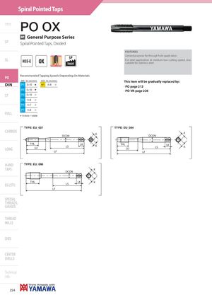 Spiral Pointed Taps Intro PO OX GP General Purpose Series SP Spiral Pointed Taps, Oxided FEATURES SL HSS-E OX 5PTHCHT General purpose for through hole application.For steel application at medium-low cutting speed, alsosuitable for stainless steel. PO Recommended Tapping Speeds Depending On Materials ISO Vc (m/min) ISO Vc (m/min) This item will be gradually replaced by: DIN P1 5÷10 H M1 4÷8 I . PO page 212 P2 5÷10 H . PO-VA page 226 ST P3 5÷10 I P4 5÷8 I P5 4÷7 I P7 4÷8 I ROLL H 1st choice I suitable DIN-PO OX TYPE: EU_057 TYPE: EU_084 CARBIDE DCON K KDCON THLLONGLU LKLS K THL LU LKLS K LF LF HAND TYPE: EU_086 TAPS K DCON THLEG (STI) LKLS K LF SPECIAL THREADS, GAUGES THREAD MILLS DIES CENTER DRILLS Technical info 224