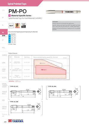 Spiral Pointed Taps Intro PM-PO MS Material Specific Series SP Spiral Pointed Taps for Hard Materials (<45HRC) FEATURES SL HSS-P 5.5PTHCHT Material specific for through hole application.Specific design and high class HSSP for stable and longlife on alloy steel and tool steel (30 ÷ 45HRC) application. Reliable and high performance tapping for the mould&die industry. PO Recommended Tapping Speeds Depending On Materials ISO Vc (m/min) DIN P3 2÷10 H P4 2÷7 H ST P5 2÷7 H P6 2÷5 H H 1st choice I suitable ROLL DIN-PM-PO Product Features CARBIDE ISO Materials Hardness Recommended tapping speed (Vc <5m/min) 5m/min LONG P6 High tensilestrength steel40÷45 HRC EH (HSS-Co) HAND Tool steelP5(100MnCrW4-1.251030÷40 HRC PM (HSS-P) TAPS 40CrMnMo7-1.2311) High alloy P4 steel 25÷30 HRC EG (STI) (CrMo, NiCrMo) Most Suitable Suitable SPECIAL THREADS, GAUGES TYPE: EU_057 TYPE: EU_084 DCON K KDCON THREAD MILLS THL LU LKLS K THL LU LKLS K LF LF DIES TYPE: EU_086 K DCON CENTER DRILLS THL LKLS K LF Technical info 228