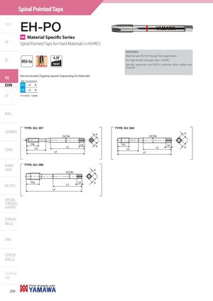 Spiral Pointed Taps Intro EH-PO MS Material Specific Series SP Spiral Pointed Taps for Hard Materials (<45HRC) FEATURES SL HSS-Co 4.5P Material specific for through hole application.For high tensile strength steel <45HRC. THCHT Specific geometry and HSSCo substrate allow stable and long life. PO Recommended Tapping Speeds Depending On Materials ISO Vc (m/min) DIN P5 ≤5 H P6 ≤5 H ST H 1st choice I suitable ROLL DIN-EH-PO TYPE: EU_057 TYPE: EU_084 CARBIDE DCON K KDCON THLLONGLU LKLS K THL LU LKLS K LF LF HAND TYPE: EU_086 TAPS K DCON THLEG (STI) LKLS K LF SPECIAL THREADS, GAUGES THREAD MILLS DIES CENTER DRILLS Technical info 230