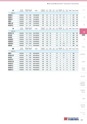 h stock standard, ) check stock EU, f check stock JP, m stock exhaustion M TCTR Ø Hole Ø(tolerance)(mm)(mm)CodeTHCHT(chamfer)LF(mm)THL(mm) LU(mm) LS DCON K(mm)(mm)(mm)LK(mm)NOFTypeStock Intro DIN 371 M3X0.5 ISO2X(6HX) 2.5 2.56 PD3.0GBDCB 4.5P 56 9 18 34 3.5 2.7 6 3 057 h M4X0.7 ISO2X(6HX) 3.3 3.38 PD4.0IBDCB 4.5P 63 13 21 38 4.5 3.4 6 3 057 h SP M5X0.8 ISO2X(6HX) 4.2 4.28 PD5.0KBDCB 4.5P 70 14 25 39 6 4.9 8 3 057 h M6X1 ISO2X(6HX) 5 5.09 PD6.0MBDCB 4.5P 80 15 30 45 6 4.9 8 3 057 h M8X1.25 ISO2X(6HX) 6.8 6.85 PD8.0NBDCB 4.5P 90 19 35 47 8 6.2 9 3 084 h M10X1.5 ISO2X(6HX) 8.5 8.6 PD010OBDCB 4.5P 100 23 39 52 10 8 11 3 084 h SL M TCTR Ø Hole Ø(tolerance)(mm)(mm)CodeTHCHT(chamfer)LF(mm)THL(mm) LU(mm) LS DCON K(mm)(mm)(mm)LK(mm)NOFTypeStock DIN 376 PO M12X1.75 ISO2X(6HX) 10.3 10.36 PG012PBDCB 4.5P 110 26 - 56 9 7 10 3 086 h M14X2 ISO2X(6HX) 12 12.12 PG014QBDCB 4.5P 110 26 - 56 11 9 12 3 086 h DIN M16X2 ISO2X(6HX) 14 14.12 PG016QBDCB 4.5P 110 26 - 56 12 9 12 3 086 h M18X2.5 ISO2X(6HX) 15.5 15.63 PG018RBDCB 4.5P 125 33 - 64 14 11 14 3 086 h ST M20X2.5 ISO2X(6HX) 17.5 17.63 PG020RBDCB 4.5P 140 33 - 71 16 12 15 3 086 h M22X2.5 ISO2X(6HX) 19.5 19.63 PG022RBDCB 4.5P 140 33 - 71 18 14.5 17 3 086 f M24X3 ISO2X(6HX) 21 21.13 PG024SBDCB 4.5P 160 37 - 82 18 14.5 17 3 086 h ROLL MF TCTR Ø Hole Ø(tolerance)(mm)(mm)CodeTHCHT(chamfer)LF(mm)THL(mm) LU(mm) LS DCON K(mm)(mm)(mm)LK(mm)NOFTypeStock DIN 374 M8X1 ISO2X(6HX) 7 7.09 PM8.0MBDCB 4.5P 90 19 - 46 6 4.9 8 3 086 m CARBIDE M10X1.25 ISO2X(6HX) 8.8 8.85 PM010NBDCB 4.5P 100 23 - 51 7 5.5 8 3 086 m M10X1 ISO2X(6HX) 9 9.09 PM010MBDCB 4.5P 90 19 - 46 7 5.5 8 3 086 m M12X1.5 ISO2X(6HX) 10.5 10.6 PM012OBDCB 4.5P 100 21 - 51 9 7 10 3 086 m M12X1.25 ISO2X(6HX) 10.8 10.85 PM012NBDCB 4.5P 100 21 - 51 9 7 10 3 086 m LONG M14X1.5 ISO2X(6HX) 12.5 12.6 PM014OBDCB 4.5P 100 21 - 51 11 9 12 3 086 m M16X1.5 ISO2X(6HX) 14.5 14.6 PM016OBDCB 4.5P 100 21 - 51 12 9 12 3 086 m M18X1.5 ISO2X(6HX) 16.5 16.6 PM018OBDCB 4.5P 110 24 - 56 14 11 14 3 086 m HAND M20X1.5 ISO2X(6HX) 18.5 18.6 PM020OBDCB 4.5P 125 24 - 64 16 12 15 3 086 m TAPS EG (STI) SPECIAL THREADS, GAUGES THREAD MILLS DIES CENTER DRILLS Technical info 231