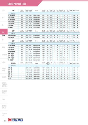 Spiral Pointed Taps Intro UNC TCTR Ø Hole Ø(tolerance)(mm)(mm)CodeTHCHT(chamfer)LF(mm)THL(mm) LU(mm) LS DCON K(mm)(mm)(mm)LK(mm)NOFTypeStock DIN 376 7/16-14UNC 2BX 9.4 9.45 PGU07QYGEX 4.5P 100 23 - 51 8 6.2 9 3 086 h SP 1/2-13UNC 2BX 10.9 10.91 PGU08RYGEX 4.5P 110 26 - 56 9 7 10 3 086 h 9/16-12UNC 2BX 12.2 12.33 PGU09SYGEX 4.5P 110 26 - 56 11 9 12 3 086 h 5/8-11UNC 2BX 13.6 13.75 PGU10UYGEX 4.5P 110 26 - 56 12 9 12 3 086 h 3/4-10UNC 2BX 16.6 16.7 PGU12VYGEX 4.5P 125 33 - 64 14 11 14 3 086 h SL 7/8-9UNC 2BX 19.6 19.61 PGU14WYGEX 4.5P 140 33 - 71 18 14.5 17 3 086 h 1 -8UNC 2BX 22.3 22.45 PGU16XYGEX 4.5P 160 37 - 82 18 14.5 17 3 086 h PO UNF TCTR Ø Hole Ø(tolerance)(mm)(mm)CodeTHCHT(chamfer)LF(mm)THL(mm) LU(mm) LS DCON K(mm)(mm)(mm)LK(mm)NOFTypeStock DIN 371 DIN No.10-32UNF 2BX 4.1 4.12 PDUNAJYGEX 4.5P 70 14 24 39 6 4.9 8 3 057 h 1/4-28UNF 2BX 5.5 5.53 PDU04KYGEX 4.5P 80 15 30 42 7 5.5 8 3 057 h ST UNF TCTR Ø Hole Ø(tolerance)(mm)(mm)CodeTHCHT(chamfer)LF(mm)THL(mm) LU(mm) LS DCON K(mm)(mm)(mm)LK(mm)NOFTypeStock DIN 374 5/16-24UNF 2BX 6.9 6.97 PMU05MYGEX 4.5P 90 19 - 46 6 4.9 8 3 086 h ROLL 3/8-24UNF 2BX 8.5 8.57 PMU06MYGEX 4.5P 100 23 - 51 7 5.5 8 3 086 h 1/2-20UNF 2BX 11.5 11.54 PMU08NYGEX 4.5P 100 21 - 51 9 7 10 3 086 h 9/16-18UNF 2BX 12.9 13 PMU09OYGEX 4.5P 100 21 - 51 11 9 12 3 086 h CARBIDE 5/8-18UNF 2BX 14.5 14.6 PMU10OYGEX 4.5P 100 21 - 51 12 9 12 3 086 h 3/4-16UNF 2BX 17.5 17.59 PMU12PYGEX 4.5P 110 24 - 56 14 11 14 3 086 h 7/8-14UNF 2BX 20.5 20.57 PMU14QYGEX 4.5P 125 24 - 64 18 14.5 17 3 086 h 1 -12UNF 2BX 23.3 23.46 PMU16SYGEX 4.5P 140 27 - 71 18 14.5 17 3 086 h LONG G(BSP) TCTR Ø Hole Ø(tolerance)(mm)(mm)CodeTHCHT(chamfer)Basicmajor Ø(mm)LF(mm)THL(mm)LSDCON K(mm)(mm)(mm)LK(mm)NOFTypeStock DIN 5156 HAND 1/8-28 - 8.75 8.78 PVG0020GEX 4.5P 9.728 90 19 46 7 5.5 8 3 086 h TAPS 1/4-19 - 11.75 11.78 PVG0040GEX 4.5P 13.157 100 21 51 11 9 12 3 086 h 3/8-19 - 15.25 15.28 PVG0060GEX 4.5P 16.662 100 21 51 12 9 12 3 086 h 1/2-14 - 19 19.04 PVG0080GEX 4.5P 20.955 125 24 64 16 12 15 3 086 h EG (STI) 3/4-14 - 24.5 24.52 PVG0120GEX 4.5P 26.441 140 27 71 20 16 19 4 086 h 1 -11 - 30.75 30.77 PVG0160GEX 4.5P 33.249 160 29 82 25 20 23 4 086 h SPECIAL THREADS, GAUGES THREAD MILLS DIES CENTER DRILLS Technical info 234