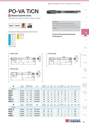 h stock standard, ) check stock EU, f check stock JP, m stock exhaustion PO-VA TiCN Intro MS Material Specific Series Spiral Pointed Taps for Stainless Steel, Coated SP FEATURES 4.5PHSS-ECOATING Material specific for through hole application.Most suitable for stainless steel, steel and alloy steel. SL THCHT Suitable coating improves wear, heat and welding resistance. Recommended Tapping Speeds Depending On Materials PO ISO Vc (m/min) ISO Vc (m/min) This item will be gradually replaced by: P1 ≤15 H M1 ≤10 H . VUPO page 210 DIN P2 ≤15 H M2 ≤10 I P3 ≤10 H ST P4 ≤10 I P7 ≤10 H H 1st choice I suitable ROLL DIN-PO-VA TiCN TYPE: EU_057 TYPE: EU_084 DCON K K CARBIDEDCON THLLU LKLS K THL LU LKLS K LONG LF LF TYPE: EU_086 HAND K TAPS DCON THL LKLS K EG (STI) LF SPECIAL M TCTR Ø Hole Ø(tolerance)(mm)(mm)CodeTHCHT(chamfer)LF(mm)THL(mm) LU(mm) LS DCON K(mm)(mm)(mm)LK(mm)NOFType Stock THREADS,GAUGES DIN 371 M3X0.5 ISO2X(6HX) 2.5 2.56 PD3.0GBGET 4.5P 56 9 18 34 3.5 2.7 6 3 057 m THREAD M4X0.7 ISO2X(6HX) 3.3 3.38 PD4.0IBGET 4.5P 63 13 21 38 4.5 3.4 6 3 057 m MILLS M5X0.8 ISO2X(6HX) 4.2 4.28 PD5.0KBGET 4.5P 70 14 25 39 6 4.9 8 3 057 m M6X1 ISO2X(6HX) 5 5.09 PD6.0MBGET 4.5P 80 15 30 45 6 4.9 8 3 057 m M8X1.25 ISO2X(6HX) 6.8 6.85 PD8.0NBGET 4.5P 90 19 35 47 8 6.2 9 3 084 m DIES M10X1.5 ISO2X(6HX) 8.5 8.6 PD010OBGET 4.5P 100 23 39 52 10 8 11 3 084 m M TCTR Ø Hole Ø(tolerance)(mm)(mm)CodeTHCHT(chamfer)LF(mm)THL(mm) LU(mm) LS DCON K(mm)(mm)(mm)LK(mm)NOFType Stock DIN 376 CENTER M12X1.75 ISO2X(6HX) 10.3 10.36 PG012PBGET 4.5P 110 26 - 56 9 7 10 3 086 m DRILLS M14X2 ISO2X(6HX) 12 12.12 PG014QBGET 4.5P 110 26 - 56 11 9 12 3 086 m M16X2 ISO2X(6HX) 14 14.12 PG016QBGET 4.5P 110 26 - 56 12 9 12 3 086 m Technical M20X2.5 ISO2X(6HX) 17.5 17.63 PG020RBGET 4.5P 140 33 - 71 16 12 15 3 086 m info 235