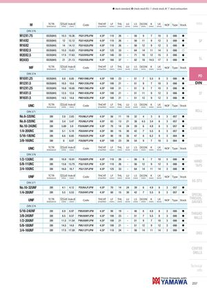 h stock standard, ) check stock EU, f check stock JP, m stock exhaustion M TCTR Ø Hole Ø(tolerance)(mm)(mm)CodeTHCHT(chamfer)LF(mm)THL(mm) LU(mm) LS DCON K(mm)(mm)(mm)LK(mm)NOFTypeStock Intro DIN 376 M12X1.75 ISO2X(6HX) 10.3 10.36 PG012PBJPW 4.5P 110 26 - 56 9 7 10 3 086 h M14X2 ISO2X(6HX) 12 12.12 PG014QBJPW 4.5P 110 26 - 56 11 9 12 3 086 h SP M16X2 ISO2X(6HX) 14 14.12 PG016QBJPW 4.5P 110 26 - 56 12 9 12 3 086 h M18X2.5 ISO2X(6HX) 15.5 15.63 PG018RBJPW 4.5P 125 33 - 64 14 11 14 3 086 f M20X2.5 ISO2X(6HX) 17.5 17.63 PG020RBJPW 4.5P 140 33 - 71 16 12 15 3 086 h M24X3 ISO2X(6HX) 21 21.13 PG024SBJPW 4.5P 160 37 - 82 18 14.5 17 3 086 h SL MF TCTR Ø Hole Ø(tolerance)(mm)(mm)CodeTHCHT(chamfer)LF(mm)THL(mm) LU(mm) LS DCON K(mm)(mm)(mm)LK(mm)NOFTypeStock DIN 374 PO M10X1.25 ISO2X(6HX) 8.8 8.85 PM010NBJPW 4.5P 100 23 - 51 7 5.5 8 3 086 h M12X1.5 ISO2X(6HX) 10.5 10.6 PM012OBJPW 4.5P 100 21 - 51 9 7 10 3 086 h DIN M12X1.25 ISO2X(6HX) 10.8 10.85 PM012NBJPW 4.5P 100 21 - 51 9 7 10 3 086 h M14X1.5 ISO2X(6HX) 12.5 12.6 PM014OBJPW 4.5P 100 21 - 51 11 9 12 3 086 h ST M16X1.5 ISO2X(6HX) 14.5 14.6 PM016OBJPW 4.5P 100 21 - 51 12 9 12 3 086 h UNC TCTR Ø Hole Ø(tolerance)(mm)(mm)CodeTHCHT(chamfer)LF(mm)THL(mm) LU(mm) LS DCON K(mm)(mm)(mm)LK(mm)NOFTypeStock DIN 371 ROLL No.6-32UNC 2BX 2.8 2.83 PDUN6JYJPW 4.5P 56 11 19 32 4 3 6 3 057 h No.8-32UNC 2BX 3.4 3.47 PDUN8JYJPW 4.5P 63 13 21 38 4.5 3.4 6 3 057 h No.10-24UNC 2BX 3.89 3.9 PDUNAMYJPW 4.5P 70 14 24 39 6 4.9 8 3 057 h CARBIDE 1/4-20UNC 2BX 5.1 5.19 PDU04NYJPW 4.5P 80 15 30 42 7 5.5 8 3 057 h 5/16-18UNC 2BX 6.6 6.65 PDU05OYJPW 4.5P 90 19 35 47 8 6.2 9 3 084 h 3/8-16UNC 2BX 8 8.07 PDU06PYJPW 4.5P 100 23 39 54 9 7 10 3 084 h UNC TCTR Ø Hole Ø(tolerance)(mm)(mm)CodeTHCHT(chamfer)LF(mm)THL(mm) LU(mm) LS DCON K(mm)(mm)(mm)LK(mm)NOFTypeStock LONG DIN 376 1/2-13UNC 2BX 10.9 10.91 PGU08RYJPW 4.5P 110 26 - 56 9 7 10 3 086 h HAND 5/8-11UNC 2BX 13.6 13.75 PGU10UYJPW 4.5P 110 26 - 56 12 9 12 3 086 h TAPS 3/4-10UNC 2BX 16.6 16.7 PGU12VYJPW 4.5P 125 33 - 64 14 11 14 3 086 h UNF TCTR Ø Hole Ø(tolerance)(mm)(mm)CodeTHCHT(chamfer)LF(mm)THL(mm) LU(mm) LS DCON K(mm)(mm)(mm)LK(mm)NOFTypeStock DIN 371 EG (STI) No.10-32UNF 2BX 4.1 4.12 PDUNAJYJPW 4.5P 70 14 24 39 6 4.9 8 3 057 h 1/4-28UNF 2BX 5.5 5.53 PDU04KYJPW 4.5P 80 15 30 42 7 5.5 8 3 057 h SPECIAL UNF TCTR Ø Hole Ø(tolerance)(mm)(mm)CodeTHCHT(chamfer)LF(mm)THL(mm) LU(mm) LS DCON K(mm)(mm)(mm)LK(mm)NOFTypeStock THREADS,GAUGES DIN 374 5/16-24UNF3/8-24UNF 2BX 6.9 6.97 PMU05MYJPW 4.5P 90 19 - 46 6 4.9 8 3 086 h2BX8.58.57PMU06MYJPW4.5P10023-5175.583086hTHREADMILLS 1/2-20UNF 2BX 11.5 11.54 PMU08NYJPW 4.5P 100 21 - 51 9 7 10 3 086 h 5/8-18UNF 2BX 14.5 14.6 PMU10OYJPW 4.5P 100 21 - 51 12 9 12 3 086 h 3/4-16UNF 2BX 17.5 17.59 PMU12PYJPW 4.5P 110 24 - 56 14 11 14 3 086 h DIES CENTER DRILLS Technical info 237