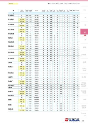 Oversized h stock standard, ) check stock EU, f check stock JP, m stock exhaustion M TCTR Ø Hole Ø(tolerance)(mm)(mm)CodeTHCHT(chamfer)LF(mm)THL(mm) LU(mm) LS DCON K(mm)(mm)(mm)LK(mm)NOFTypeStock Intro JIS M1.2X0.25 P1 0.95 0.97 POP1.2B 5P 36 4.5 - 24 3 2.5 5 2 005 ) P1 1.1 1.13 POP1.4C 5P 36 5.4 - 24 3 2.5 5 2 005 ) SP M1.4X0.3 P2(P1+15) 1.1 1.13 POQ1.4C 5P 36 5.4 - 24 3 2.5 5 2 005 f P3(P1+30) 1.1 1.13 POR1.4C 5P 36 5.4 - 24 3 2.5 5 2 005 f P2 1.25 1.3 POQ1.6D 5P 36 6.3 - 24 3 2.5 5 2 005 ) M1.6X0.35 P3(P2+15) 1.25 1.3 POR1.6D 5P 36 6.3 - 24 3 2.5 5 2 005 f SL P2 1.35 1.4 POQ1.7D 5P 36 6.3 - 24 3 2.5 5 2 005 ) M1.7X0.35 P3(P2+15) 1.35 1.4 POR1.7D 5P 36 6.3 - 24 3 2.5 5 2 005 f P4(P2+30) 1.35 1.4 POS1.7D 5P 36 6.3 - 24 3 2.5 5 2 005 f PO M1.8X0.35 P2 1.45 1.5 POQ1.8D 5P 42 6.3 - 27 3 2.5 5 2 005 ) P2 1.6 1.65 POQ2.0E 5P 42 7.2 12 27 3 2.5 5 3 001 f JIS M2X0.4 P3(P2+15) 1.6 1.65 POR2.0E 5P 42 7.2 12 27 3 2.5 5 3 001 f P4(P2+30) 1.6 1.65 POS2.0E 5P 42 7.2 12 27 3 2.5 5 3 001 f ST M2.2X0.45 P2 1.75 1.81 POQ2.2F 5P 42 8.1 12 27 3 2.5 5 3 001 ) P2 1.9 1.95 POQ2.3E 5P 42 7.2 12 27 3 2.5 5 3 001 ) M2.3X0.4 P3(P2+15) 1.9 1.95 POR2.3E 5P 42 7.2 12 27 3 2.5 5 3 001 fP4(P2+30)1.91.95POS2.3E5P427.2122732.553001fROLL P2 2.1 2.11 POQ2.5F 5P 46 8.1 14 29 3 2.5 5 3 001 f M2.5X0.45 P3(P2+15) 2.1 2.11 POR2.5F 5P 46 8.1 14 29 3 2.5 5 3 001 f P4(P2+30) 2.1 2.11 POS2.5F 5P 46 8.1 14 29 3 2.5 5 3 001 f CARBIDE P2 2.2 2.21 POQ2.6F 5P 46 8.1 14 29 3 2.5 5 3 001 f M2.6X0.45 P3(P2+15) 2.2 2.21 POR2.6F 5P 46 8.1 14 29 3 2.5 5 3 001 f P4(P2+30) 2.2 2.21 POS2.6F 5P 46 8.1 14 29 3 2.5 5 3 001 f 3M0.6 P2 2.45 2.47 POQ3.0H 5P 46 9 14 26 4 3.2 6 3 001 f LONG P2 2.5 2.56 POQ3.0G 5P 46 9 14 26 4 3.2 6 3 001 f M3X0.5 P3(P2+15) 2.5 2.56 POR3.0G 5P 46 9 14 26 4 3.2 6 3 001 f P4(P2+30) 2.5 2.56 POS3.0G 5P 46 9 14 26 4 3.2 6 3 001 f HAND P2 2.9 2.97 POQ3.5H 5P 52 11 16 29 5 4 7 3 001 f TAPS M3.5X0.6 P3(P2+15) 2.9 2.97 POR3.5H 5P 52 11 16 29 5 4 7 3 001 f P4(P2+30) 2.9 2.97 POS3.5H 5P 52 11 16 29 5 4 7 3 001 f 4M0.75 P2 3.3 3.33 POQ4.0J 5P 52 11 17 29 5 4 7 3 001 f EG (STI) P2 3.3 3.38 POQ4.0I 5P 52 11 17 29 5 4 7 3 001 f M4X0.7 P3(P2+20) 3.3 3.38 POR4.0I 5P 52 11 17 29 5 4 7 3 001 f P4(P2+40) 3.3 3.38 POS4.0I 5P 52 11 17 29 5 4 7 3 001 f SPECIAL M4.5X0.75 P2 3.8 3.83 POQ4.5J 5P 60 13 21 33 5.5 4.5 7 3 001 ) THREADS,GAUGES 5M0.9 P2 4.15 4.19 POQ5.0L 5P 60 13 22 33 5.5 4.5 7 3 001 f P2 4.2 4.28 POQ5.0K 5P 60 13 22 33 5.5 4.5 7 3 001 f M5X0.8 P3(P2+20) 4.2 4.28 POR5.0K 5P 60 13 22 33 5.5 4.5 7 3 001 f THREAD P4(P2+40) 4.2 4.28 POS5.0K 5P 60 13 22 33 5.5 4.5 7 3 001 f MILLS M5.5X0.9 P2 4.65 4.69 POQ5.5L 5P 62 15 26 33 6 4.5 7 3 001 ) P2 5 5.09 POQ6.0M 5P 62 15 26 33 6 4.5 7 3 001 f M6X1 P3(P2+20) 5 5.09 POR6.0M 5P 62 15 26 33 6 4.5 7 3 001 f DIES P4(P2+40) 5 5.09 POS6.0M 5P 62 15 26 33 6 4.5 7 3 001 f P2 6 6.09 POQ7.0M 5P 70 19 - 36 6.2 5 8 3 002 f M7X1 P3(P2+20) 6 6.09 POR7.0M 5P 70 19 - 36 6.2 5 8 3 002 f CENTER P3 6.8 6.85 POR8.0N 5P 70 19 - 36 6.2 5 8 3 002 f DRILLS M8X1.25 P4(P3+20) 6.8 6.85 POS8.0N 5P 70 19 - 36 6.2 5 8 3 002 f Technical info 239