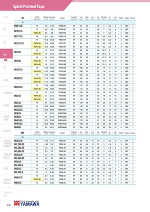 Spiral Pointed Taps Intro M TCTR Ø Hole Ø(tolerance)(mm)(mm)CodeTHCHT(chamfer)LF(mm)THL(mm) LU(mm) LS DCON K(mm)(mm)(mm)LK(mm)NOFTypeStock JIS M9X1.25 P3 7.8 7.85 POR9.0N 5P 75 23 - 38 7 5.5 8 3 002 f SP M10X1.5 P3 8.5 8.6 POR010O 5P 75 23 - 38 7 5.5 8 3 002 f P4(P3+20) 8.5 8.6 POS010O 5P 75 23 - 38 7 5.5 8 3 002 f M11X1.5 P4 9.5 9.6 POS011O 5P 82 26 - 42 8.5 6.5 9 3 002 f P4 10.3 10.36 POS012P 5P 82 26 - 42 8.5 6.5 9 3 002 f SL M12X1.75 P5(P4+20) 10.3 10.36 POT012P 5P 82 26 - 42 8.5 6.5 9 3 002 f P6(P4+40) 10.3 10.36 POU012P 5P 82 26 - 42 8.5 6.5 9 3 002 f P4 12 12.12 POS014Q 5P 88 26 - 45 10.5 8 11 3 002 f M14X2 PO P5(P4+20) 12 12.12 POT014Q 5P 88 26 - 45 10.5 8 11 3 002 f P4 14 14.12 POS016Q 5P 95 26 - 48 12.5 10 13 3 002 f JIS M16X2 P5(P4+20) 14 14.12 POT016Q 5P 95 26 - 48 12.5 10 13 3 002 f P6(P4+40) 14 14.12 POU016Q 5P 95 26 - 48 12.5 10 13 3 002 f ST P4 15.5 15.63 POS018R 5P 100 33 - 51 14 11 14 3 002 f M18X2.5 P5(P4+20) 15.5 15.63 POT018R 5P 100 33 - 51 14 11 14 3 002 f P4 17.5 17.63 POS020R 5P 105 33 - 50 15 12 15 3 002 f ROLL M20X2.5 P5(P4+20) 17.5 17.63 POT020R 5P 105 33 - 50 15 12 15 3 002 fP6(P4+40)17.517.63POU020R5P10533-501512153002f P4 19.5 19.63 POS022R 5P 115 33 - 55 17 13 16 3 002 f M22X2.5 P5(P4+20) 19.5 19.63 POT022R 5P 115 33 - 55 17 13 16 3 002 f CARBIDE P4 21 21.13 POS024S 5P 120 39 - 55 19 15 18 3 002 f M24X3 P5(P4+20) 21 21.13 POT024S 5P 120 39 - 55 19 15 18 3 002 f P6(P4+40) 21 21.13 POU024S 5P 120 39 - 55 19 15 18 3 002 f M27X3 P4 24 24.13 POS027S 5P 130 39 - 60 20 15 18 4 002 f LONG M30X3.5 P5 26.5 26.63 POT030T 5P 135 46 - 62 23 17 20 4 002 f M33X3.5 P5 29.5 29.63 POMT033T 5P 145 46 - 67 25 19 22 4 002 f M36X4 P5 32 32.12 POMT036U 5P 155 52 - 71 28 21 24 4 002 f HAND M39X4 P5 35 35.12 POMT039U 5P 165 52 - 76 30 23 26 4 002 f TAPS M42X4.5 P5 37.5 37.63 POMT042V 5P 175 59 - 81 32 26 30 4 002 f M45X4.5 P5 40.5 40.63 POMT045V 5P 180 59 - 83 35 26 30 4 002 f M48X5 P5 43 43.12 POMT048W 5P 185 65 - 85 38 29 32 4 002 f EG (STI) MF TCTR Ø Hole Ø(tolerance)(mm)(mm)CodeTHCHT(chamfer)LF(mm)THL(mm) LU(mm) LS DCON K(mm)(mm)(mm)LK(mm)NOFTypeStock JIS SPECIAL M2X0.25 P1 1.75 1.77 POP2.0B 5P 42 4.5 12 27 3 2.5 5 3 001 f THREADS,GAUGESM2.2X0.25 P2 1.95 1.97 POQ2.2B 5P 42 4.5 12 27 3 2.5 5 3 001 f M2.5X0.35 P2 2.2 2.2 POQ2.5D 5P 46 6.3 14 29 3 2.5 5 3 001 f M2.6X0.35 P2 2.3 2.3 POQ2.6D 5P 46 6.3 14 29 3 2.5 5 3 001 f THREAD M3X0.35 P2 2.7 2.7 POQ3.0D 5P 46 6.5 14 26 4 3.2 6 3 001 f MILLS M3.5X0.35 P2 3.2 3.2 POQ3.5D 5P 52 6.5 16 29 5 4 7 3 001 f M4X0.5 P2 3.5 3.56 POQ4.0G 5P 52 9 17 29 5 4 7 3 001 f M4.5X0.5 P2 4 4.06 POQ4.5G 5P 60 9 21 33 5.5 4.5 7 3 001 f DIES M5X0.5 P2 4.5 4.56 POQ5.0G 5P 60 9 22 33 5.5 4.5 7 3 001 f M5.5X0.5 P2 5 5.06 POQ5.5G 5P 62 9 26 33 6 4.5 7 3 001 f P2 5.3 5.33 POQ6.0J 5P 62 15 26 33 6 4.5 7 3 001 f M6X0.75 CENTER P3(P2+20) 5.3 5.33 POR6.0J 5P 62 15 26 33 6 4.5 7 3 001 f DRILLS M6X0.5 P2 5.5 5.56 POQ6.0G 5P 62 9 26 33 6 4.5 7 3 001 f Technical info 240