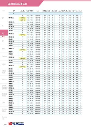 Spiral Pointed Taps Intro MF TCTR Ø Hole Ø(tolerance)(mm)(mm)CodeTHCHT(chamfer)LF(mm)THL(mm) LU(mm) LS DCON K(mm)(mm)(mm)LK(mm)NOFTypeStock JIS P3 14.5 14.6 POR016O 5P 95 26 - 48 12.5 10 13 3 002 f SP M16X1.5 P4(P3+20) 14.5 14.6 POS016O 5P 95 26 - 48 12.5 10 13 3 002 f P5(P3+40) 14.5 14.6 POT016O 5P 95 26 - 48 12.5 10 13 3 002 f M16X1.25 P3 14.8 14.85 POR016N 5P 95 26 - 48 12.5 10 13 3 002 f M16X1 P3 15 15.09 POR016M 5P 95 26 - 48 12.5 10 13 3 002 f SL M17X1.5 P4 15.5 15.6 POS017O 5P 100 33 - 51 14 11 14 3 002 f M17X1 P4 16 16.09 POS017M 5P 100 18 - 51 14 11 14 3 037 f M18X2 P4 16 16.12 POS018Q 5P 100 33 - 51 14 11 14 3 002 f PO M18X1.5 P4 16.5 16.6 POS018O 5P 100 33 - 51 14 11 14 3 002 f P5(P4+20) 16.5 16.6 POT018O 5P 100 33 - 51 14 11 14 3 002 f JIS M18X1.25 P3 16.8 16.85 POR018N 5P 100 33 - 51 14 11 14 3 002 f M18X1 P3 17 17.09 POR018M 5P 100 18 - 51 14 11 14 3 037 f ST M19X1.5 P4 17.5 17.6 POS019O 5P 105 33 - 50 15 12 15 3 002 f M19X1 P3 18 18.09 POR019M 5P 105 18 - 50 15 12 15 3 037 f M20X2 P4 18 18.12 POS020Q 5P 105 33 - 50 15 12 15 3 002 f P4 18.5 18.6 POS020O 5P 105 33 - 50 15 12 15 3 002 f ROLL M20X1.5 P5(P4+20) 18.5 18.6 POT020O 5P 105 33 - 50 15 12 15 3 002 f M20X1 P3 19 19.09 POR020M 5P 105 18 - 50 15 12 15 3 037 f M22X2 P4 20 20.12 POS022Q 5P 115 33 - 55 17 13 16 3 002 f CARBIDE M22X1.5 P4 20.5 20.6 POS022O 5P 115 33 - 55 17 13 16 3 002 f P5(P4+20) 20.5 20.6 POT022O 5P 115 33 - 55 17 13 16 3 002 f M22X1 P3 21 21.09 POR022M 5P 115 19 - 55 17 13 16 3 037 f M24X2 P4 22 22.12 POS024Q 5P 120 39 - 55 19 15 18 3 002 f LONG P4 22.5 22.6 POS024O 5P 120 39 - 55 19 15 18 3 002 f M24X1.5 P5(P4+20) 22.5 22.6 POT024O 5P 120 39 - 55 19 15 18 3 002 f M24X1 P3 23 23.09 POR024M 5P 120 19 - 55 19 15 18 3 037 f HAND M25X2 P4 23 23.12 POS025Q 5P 125 39 - 58 19 15 18 3 002 f TAPS M25X1.5 P4 23.5 23.6 POS025O 5P 125 39 - 58 19 15 18 3 002 f M25X1 P3 24 24.09 POR025M 5P 125 20 - 58 19 15 18 3 037 f M26X3 P4 23 23.12 POS026S 5P 130 39 - 60 20 15 18 4 002 f EG (STI) M26X2 P4 24 24.12 POS026Q 5P 130 39 - 60 20 15 18 4 002 f M26X1.5 P4 24.5 24.6 POS026O 5P 130 39 - 60 20 15 18 4 002 f M26X1 P3 25 25.09 POR026M 5P 130 20 - 60 20 15 18 4 037 f SPECIAL M27X2 P4 25 25.12 POS027Q 5P 130 39 - 60 20 15 18 4 002 f THREADS,GAUGESM27X1.5 P4 25.5 25.6 POS027O 5P 130 39 - 60 20 15 18 4 002 f M27X1 P3 26 26.09 POR027M 5P 130 20 - 60 20 15 18 4 037 f M28X2 P4 26 26.12 POS028Q 5P 135 46 - 62 23 17 20 4 002 f THREAD M28X1.5 P4 26.5 26.6 POS028O 5P 135 46 - 62 23 17 20 4 002 f MILLS M28X1 P3 27 27.09 POR028M 5P 135 20 - 62 23 17 20 4 037 f M30X3 P4 27 27.13 POS030S 5P 135 46 - 62 23 17 20 4 002 f M30X2 P4 28 28.12 POS030Q 5P 135 46 - 62 23 17 20 4 002 f DIES M30X1.5 P4 28.5 28.6 POS030O 5P 135 46 - 62 23 17 20 4 002 f M30X1 P3 29 29.09 POR030M 5P 135 21 - 62 23 17 20 4 037 f M32X3 P4 29 29.13 POMS032S 5P 145 46 - 67 24 19 22 4 002 f CENTER M32X2 P4 30 30.12 POMS032Q 5P 145 46 - 67 24 19 22 4 002 f DRILLS M32X1.5 P4 30.5 30.6 POMS032O 5P 145 46 - 67 24 19 22 4 002 f M33X3 P4 30 30.13 POMS033S 5P 145 46 - 67 25 19 22 4 002 f Technical info 242