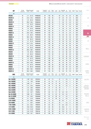 Oversized h stock standard, ) check stock EU, f check stock JP, m stock exhaustion MF TCTR Ø Hole Ø(tolerance)(mm)(mm)CodeTHCHT(chamfer)LF(mm)THL(mm) LU(mm) LS DCON K(mm)(mm)(mm)LK(mm)NOFTypeStock Intro JIS M33X2 P4 31 31.12 POMS033Q 5P 145 46 - 67 25 19 22 4 002 f M33X1.5 P4 31.5 31.6 POMS033O 5P 145 46 - 67 25 19 22 4 002 f SP M34X2 P4 32 32.12 POMS034Q 5P 155 52 - 71 28 21 24 4 002 f M34X1.5 P4 35.5 32.6 POMS034O 5P 155 26 - 71 28 21 24 4 037 f M35X2 P4 33 33.12 POMS035Q 5P 155 52 - 71 28 21 24 4 002 f M35X1.5 P4 33.5 33.6 POMS035O 5P 155 26 - 71 28 21 24 4 037 f SL M36X3 P4 33 33.13 POMS036S 5P 155 52 - 71 28 21 24 4 002 f M36X2 P4 34 34.12 POMS036Q 5P 155 52 - 71 28 21 24 4 002 f M36X1.5 P4 34.5 34.6 POMS036O 5P 155 26 - 71 28 21 24 4 037 f PO M38X2 P4 36 36.12 POMS038Q 5P 165 52 - 76 30 23 26 4 002 f M38X1.5 P4 36.5 36.6 POMS038O 5P 165 26 - 76 30 23 26 4 037 f JIS M39X3 P4 36 36.13 POMS039S 5P 165 52 - 76 30 23 26 4 002 f M39X2 P4 37 37.12 POMS039Q 5P 165 52 - 76 30 23 26 4 002 f ST M39X1.5 P4 37.5 37.6 POMS039O 5P 165 26 - 76 30 23 26 4 037 f M40X3 P4 37 37.13 POMS040S 5P 175 59 - 81 32 26 30 4 002 f M40X2M40X1.5 P4 38 38.12 POMS040Q 5P 175 59 - 81 32 26 30 4 002 fP438.538.6POMS040O5P17527-813226304037fROLL M42X3 P4 39 39.13 POMS042S 5P 175 59 - 81 32 26 30 4 002 f M42X2 P4 40 40.12 POMS042Q 5P 175 59 - 81 32 26 30 4 002 f M42X1.5 P4 40.5 40.6 POMS042O 5P 175 27 - 81 32 26 30 4 037 f CARBIDE M45X3 P4 42 42.13 POMS045S 5P 180 59 - 83 35 26 30 4 002 f M45X2 P4 43 43.12 POMS045Q 5P 180 59 - 83 35 26 30 4 002 f M45X1.5 P4 43.5 43.6 POMS045O 5P 180 27 - 83 35 26 30 4 037 f M48X3 P4 45 45.13 POMS048S 5P 185 65 - 85 38 29 32 4 002 f LONG M48X2 P4 46 46.12 POMS048Q 5P 185 65 - 85 38 29 32 4 002 f M48X1.5 P4 46.5 46.6 POMS048O 5P 185 28 - 85 38 29 32 4 037 f M50X1.5 P4 48.5 48.6 POS050O 5P 145 45 - 81 40 32 35 4 002 f HAND TAPS UNC TCTR Ø Hole Ø(tolerance)(mm)(mm)CodeTHCHT(chamfer)LF(mm)THL(mm) LU(mm) LS DCON K(mm)(mm)(mm)LK(mm)NOFTypeStock JIS No.1-64UNC P1 1.54 1.55 POPUN1D 5P 42 7.2 - 27 3 2.5 5 2 005 f EG (STI) No.2-56UNC P1 1.8 1.83 POPUN2E 5P 42 8.1 12 27 3 2.5 5 3 001 f No.3-48UNC P1 2.09 2.1 POPUN3F 5P 46 8.1 14 29 3 2.5 5 3 001 f No.4-40UNC P2 2.3 2.33 POQUN4H 5P 46 9 14 26 4 3.2 6 3 001 f SPECIAL No.5-40UNC P2 2.6 2.64 POQUN5H 5P 52 11 16 29 5 4 7 3 001 f THREADS,GAUGES No.6-32UNC P2 2.8 2.83 POQUN6J 5P 52 11 16 29 5 4 7 3 001 f No.8-32UNC P2 3.4 3.47 POQUN8J 5P 60 13 21 33 5.5 4.5 7 3 001 f No.10-24UNC P2 3.89 3.9 POQUNAM 5P 60 13 22 33 5.5 4.5 7 3 001 f THREAD No.12-24UNC P2 4.5 4.53 POQUNCM 5P 62 15 26 33 6 4.5 7 3 001 f MILLS 1/4-20UNC P2 5.1 5.19 POQU04N 5P 62 15 26 33 6 4.5 7 3 001 f 5/16-18UNC P3 6.6 6.65 PORU05O 5P 70 19 - 36 6.2 5 8 3 002 f 3/8-16UNC P3 8 8.07 PORU06P 5P 75 23 - 38 7 5.5 8 3 002 f DIES 7/16-14UNC P3 9.4 9.45 PORU07Q 5P 82 26 - 42 8.5 6.5 9 3 002 f 1/2-13UNC P3 10.9 10.91 PORU08R 5P 88 26 - 45 10.5 8 11 3 002 f 9/16-12UNC P3 12.2 12.33 PORU09S 5P 95 26 - 48 12.5 10 13 3 002 f CENTER 5/8-11UNC P3 13.6 13.75 PORU10U 5P 95 26 - 48 12.5 10 13 3 002 f DRILLS 3/4-10UNC P4 16.6 16.7 POSU12V 5P 105 33 - 50 15 12 15 3 002 f Technical info 243