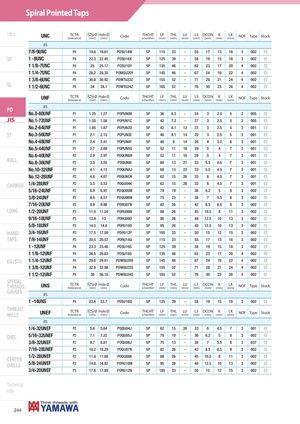 Spiral Pointed Taps Intro UNC TCTR Ø Hole Ø(tolerance)(mm)(mm)CodeTHCHT(chamfer)LF(mm)THL(mm) LU(mm) LS DCON K(mm)(mm)(mm)LK(mm)NOFTypeStock JIS 7/8-9UNC P4 19.6 19.61 POSU14W 5P 115 33 - 55 17 13 16 3 002 f SP 1 -8UNC P4 22.3 22.45 POSU16X 5P 125 39 - 58 19 15 18 3 002 f 1 1/8-7UNC P4 25 25.17 POSU18Y 5P 135 46 - 62 23 17 20 4 002 f 1 1/4-7UNC P4 28.2 28.35 POMSU20Y 5P 145 46 - 67 24 19 22 4 002 f 1 3/8-6UNC P5 30.8 30.92 POMTU22Z 5P 155 52 - 71 28 21 24 4 002 f SL 1 1/2-6UNC P5 34 34.1 POMTU24Z 5P 165 52 - 76 30 23 26 4 002 f UNF TCTR Ø Hole Ø(tolerance)(mm)(mm)CodeTHCHT(chamfer)LF(mm)THL(mm) LU(mm) LS DCON K(mm)(mm)(mm)LK(mm)NOFTypeStock PO JIS No.0-80UNF P1 1.25 1.27 POPUN0B 5P 36 6.3 - 24 3 2.5 5 2 005 f JIS No.1-72UNF P1 1.55 1.58 POPUN1C 5P 42 7.2 - 27 3 2.5 5 2 005 f No.2-64UNF P1 1.85 1.87 POPUN2D 5P 42 8.1 12 27 3 2.5 5 3 001 f ST No.3-56UNF P1 2.1 2.15 POPUN3E 5P 46 8.1 14 29 3 2.5 5 3 001 f No.4-48UNF P1 2.4 2.41 POPUN4F 5P 46 9 14 26 4 3.2 6 3 001 f No.5-44UNF P1 2.7 2.69 POPUN5G 5P 52 11 16 29 5 4 7 3 001 f No.6-40UNF P2 2.9 2.97 POQUN6H 5P 52 11 16 29 5 4 7 3 001 f ROLL No.8-36UNF P2 3.5 3.55 POQUN8I 5P 60 13 21 33 5.5 4.5 7 3 001 f No.10-32UNF P2 4.1 4.12 POQUNAJ 5P 60 13 22 33 5.5 4.5 7 3 001 f No.12-28UNF P2 4.6 4.67 POQUNCK 5P 62 15 26 33 6 4.5 7 3 001 f CARBIDE 1/4-28UNF P2 5.5 5.53 POQU04K 5P 62 15 26 33 6 4.5 7 3 001 f 5/16-24UNF P2 6.9 6.97 POQU05M 5P 70 19 - 36 6.2 5 8 3 002 f 3/8-24UNF P2 8.5 8.57 POQU06M 5P 75 23 - 38 7 5.5 8 3 002 f 7/16-20UNF P3 9.9 9.96 PORU07N 5P 82 26 - 42 8.5 6.5 9 3 002 f LONG 1/2-20UNF P3 11.5 11.54 PORU08N 5P 88 26 - 45 10.5 8 11 3 002 f 9/16-18UNF P3 12.9 13 PORU09O 5P 95 26 - 48 12.5 10 13 3 002 f 5/8-18UNF P3 14.5 14.6 PORU10O 5P 95 26 - 48 12.5 10 13 3 002 f HAND 3/4-16UNF P3 17.5 17.59 PORU12P 5P 105 33 - 50 15 12 15 3 002 f TAPS 7/8-14UNF P3 20.5 20.57 PORU14Q 5P 115 33 - 55 17 13 16 3 002 f 1 -12UNF P4 23.3 23.46 POSU16S 5P 125 39 - 58 19 15 18 3 002 f 1 1/8-12UNF P4 26.5 26.63 POSU18S 5P 135 46 - 62 23 17 20 4 002 f EG (STI) 1 1/4-12UNF P4 29.6 29.81 POMSU20S 5P 145 46 - 67 24 19 22 4 002 f 1 3/8-12UNF P4 32.8 32.98 POMSU22S 5P 155 52 - 71 28 21 24 4 002 f 1 1/2-12UNF P4 36 36.16 POMSU24S 5P 165 52 - 76 30 23 26 4 002 f SPECIALTHREADS, UNS TCTR Ø Hole Ø(tolerance)(mm)(mm)CodeTHCHT(chamfer)LF(mm)THL(mm) LU(mm) LS DCON K(mm)(mm)(mm)LK(mm)NOFTypeStock GAUGES JIS 1 -14UNS P4 23.6 23.7 POSU16Q 5P 125 39 - 58 19 15 18 3 002 f THREADMILLS UNEF TCTR Ø Hole Ø(tolerance)(mm)(mm)CodeTHCHT(chamfer)LF(mm)THL(mm) LU(mm) LS DCON K(mm)(mm)(mm)LK(mm)NOFTypeStock JIS 1/4-32UNEF P2 5.6 5.64 POQU04J 5P 62 15 26 33 6 4.5 7 3 001 f DIES 5/16-32UNEF P2 7.1 7.22 POQU05J 5P 70 19 - 36 6.2 5 8 3 002 f 3/8-32UNEF P2 8.7 8.81 POQU06J 5P 75 13 - 38 7 5.5 8 3 037 f 7/16-28UNEF P2 10.2 10.29 POQU07K 5P 82 26 - 42 8.5 6.5 9 3 002 f CENTER 1/2-28UNEF P2 11.8 11.88 POQU08K 5P 88 26 - 45 10.5 8 11 3 002 f DRILLS 5/8-24UNEF P3 14.8 14.92 PORU10M 5P 95 26 - 48 12.5 10 13 3 002 f 3/4-20UNEF P3 17.8 17.89 PORU12N 5P 105 33 - 50 15 12 15 3 002 f Technical info 244