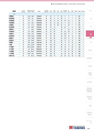 h stock standard, ) check stock EU, f check stock JP, m stock exhaustion BSW TCTR Ø Hole Ø(tolerance)(mm)(mm)CodeTHCHT(chamfer)LF(mm)THL(mm) LU(mm) LS DCON K(mm)(mm)(mm)LK(mm)NOFTypeStock Intro JIS 1/8W40 P2 2.55 2.56 POQW02H 5P 52 11 17 29 5 4 7 3 001 f 5/32W32 P2 3.15 3.2 POQW2HJ 5P 52 11 17 29 5 4 7 3 001 f SP 3/16W24 P2 3.7 3.7 POQW03M 5P 60 13 21 33 5.5 4.5 7 3 001 f 7/32W24 P2 4.5 4.52 POQW3HM 5P 62 15 26 33 6 4.5 7 3 001 f 1/4W20 P3 5.1 5.13 PORW04N 5P 62 15 26 33 6 4.5 7 3 001 f 5/16W18 P3 6.5 6.59 PORW05O 5P 70 19 - 36 6.2 5 8 3 002 f SL 3/8W16 P3 8 8.02 PORW06P 5P 75 23 - 38 7 5.5 8 3 002 f 7/16W14 P3 9.3 9.39 PORW07Q 5P 82 26 - 42 8.5 6.5 9 3 002 f 1/2W12 P3 10.6 10.7 PORW08S 5P 88 26 - 45 10.5 8 11 3 002 f PO 9/16W12 P3 12.25 12.29 PORW09S 5P 95 26 - 48 12.5 10 13 3 002 f 5/8W11 P3 13.5 13.68 PORW10U 5P 95 26 - 48 12.5 10 13 3 002 f JIS 3/4W10 P4 16.5 16.63 POSW12V 5P 105 33 - 50 15 12 15 3 002 f 7/8W9 P4 19.5 19.53 POSW14W 5P 115 33 - 55 17 13 16 3 002 f ST 1 W8 P4 22.2 22.34 POSW16X 5P 125 39 - 58 19 15 18 3 002 f 1 1/8W7 P4 24.75 25.04 POSW18Y 5P 135 46 - 62 23 17 20 4 002 f 1 1/4W71 3/8W6 P4 28 28.21 POMSW20Y 5P 145 46 - 67 24 19 22 4 002 fP530.530.72POMTW22Z5P15552-712821244002fROLL 1 1/2W6 P5 33.75 33.9 POMTW24Z 5P 165 52 - 76 30 23 26 4 002 f 2 W4 1/2 P5 45 45.15 POTW329 5P 195 70 - 85 40 32 35 4 002 f CARBIDE LONG HAND TAPS EG (STI) SPECIAL THREADS, GAUGES THREAD MILLS DIES CENTER DRILLS Technical info 245