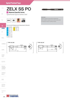 Spiral Pointed Taps Intro ZELX SS PO MS Material Specific Series SP Spiral Pointed Taps for Stainless Steel FEATURES SL HSS-E OX 4.5PTHCHT Material specific for through hole application.Most suitable for stainless steel, steel and alloy steel.OX treatment reduces welding troubles. PO Recommended Tapping Speeds Depending On Materials ISO Vc (m/min) ISO Vc (m/min) ANSI P1 ≤10 H M1 ≤10 H P2 ≤10 H M2 ≤10 H ST P3 ≤10 H P4 ≤10 I P7 ≤10 H H 1st choice I suitable ROLL ANSI-ZELX SS PO TYPE: US_030 TYPE: US_007 CARBIDE KDCON KDCON THLLONGLU LK K THL LK KLS LF LF HAND TAPS EG (STI) SPECIAL THREADS, GAUGES THREAD MILLS DIES CENTER DRILLS Technical info 256
