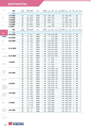 Spiral Pointed Taps Intro UNC TCTR Ø Hole Ø(tolerance)(mm)(mm)CodeTHCHT(chamfer)LF(inch)THL(inch)LU(inch) LS DCON K(inch)(inch)(inch)LK(inch)NOFTypeStock ANSI 1 1/8-7UNC GH6 25 25.17 Y82700 4.5P 5.437 1.535 - - 0.9 0.672 0.875 4 007 f SP 1 1/4-7UNC GH6 28.2 28.35 Y82702 4.5P 5.75 1.535 - - 1.02 0.766 1 4 007 f 1 3/8-6UNC GH6 30.8 30.92 Y82705 4.5P 6.062 1.811 - - 1.11 0.831 1.062 4 007 f 1 1/2-6UNC GH6 34 34.1 Y82707 4.5P 6.375 1.811 - - 1.23 0.925 1.125 4 007 f 1 3/4-5UNC GH7 39.5 39.61 Y82709 4.5P 7 1.929 - - 1.43 1.072 1.25 4 007 f SL 2 -4.5UNC GH7 45.2 45.37 Y82710 4.5P 7.625 1.929 - - 1.64 1.233 1.375 4 007 f UNF TCTR Ø Hole Ø(tolerance)(mm)(mm)CodeTHCHT(chamfer)LF(inch)THL(inch)LU(inch) LS DCON K(inch)(inch)(inch)LK(inch)NOFTypeStock PO ANSI No.4-48UNF GH2 2.4 2.41 Y82683 4.5P 1.875 0.335 0.562 - 0.14 0.11 0.187 2 030 f ANSI GH2 2.9 2.97 Y82684 4.5P 2 0.413 0.687 - 0.14 0.11 0.187 3 030 f No.6-40UNF GH3 2.9 2.97 Y82642 4.5P 2 0.413 0.687 - 0.14 0.11 0.187 3 030 f ST No.8-36UNF GH2 3.5 3.55 Y82686 4.5P 2.125 0.453 0.75 - 0.17 0.131 0.25 3 030 f GH2 4.1 4.12 Y82611 4.5P 2.375 0.531 0.875 - 0.19 0.152 0.25 3 030 f GH3 4.1 4.12 Y82610 4.5P 2.375 0.531 0.875 - 0.19 0.152 0.25 3 030 f GH4 4.1 4.12 Y82630 4.5P 2.375 0.531 0.875 - 0.19 0.152 0.25 3 030 f ROLL No.10-32UNF GH5 4.1 4.12 Y82640 4.5P 2.375 0.531 0.875 - 0.19 0.152 0.25 3 030 f GH6 4.1 4.12 Y82661 4.5P 2.375 0.531 0.875 - 0.19 0.152 0.25 3 030 f GH7 4.1 4.12 Y82670 4.5P 2.375 0.531 0.875 - 0.19 0.152 0.25 3 030 f CARBIDE No.12-28UNF GH3 4.6 4.67 Y82689 4.5P 2.375 0.571 0.937 - 0.22 0.165 0.281 3 030 f GH3 5.5 5.53 Y82614 4.5P 2.5 0.591 1 - 0.26 0.191 0.312 3 030 f GH4 5.5 5.53 Y82631 4.5P 2.5 0.591 1 - 0.26 0.191 0.312 3 030 f 1/4-28UNF GH5 5.5 5.53 Y82644 4.5P 2.5 0.591 1 - 0.26 0.191 0.312 3 030 f LONG GH6 5.5 5.53 Y82662 4.5P 2.5 0.591 1 - 0.26 0.191 0.312 3 030 f GH7 5.5 5.53 Y82674 4.5P 2.5 0.591 1 - 0.26 0.191 0.312 3 030 f GH3 6.9 6.97 Y82616 4.5P 2.718 0.669 1.125 - 0.32 0.238 0.375 3 030 f HAND GH4 6.9 6.97 Y82632 4.5P 2.718 0.669 1.125 - 0.32 0.238 0.375 3 030 f TAPS 5/16-24UNF GH5 6.9 6.97 Y82646 4.5P 2.718 0.669 1.125 - 0.32 0.238 0.375 3 030 f GH6 6.9 6.97 Y82663 4.5P 2.718 0.669 1.125 - 0.32 0.238 0.375 3 030 f GH7 6.9 6.97 Y82676 4.5P 2.718 0.669 1.125 - 0.32 0.238 0.375 3 030 f EG (STI) GH3 8.5 8.57 Y82618 4.5P 2.937 0.748 1.25 - 0.38 0.286 0.437 3 030 f GH4 8.5 8.57 Y82633 4.5P 2.937 0.748 1.25 - 0.38 0.286 0.437 3 030 f 3/8-24UNF GH5 8.5 8.57 Y82648 4.5P 2.937 0.748 1.25 - 0.38 0.286 0.437 3 030 f SPECIAL GH6 8.5 8.57 Y82664 4.5P 2.937 0.748 1.25 - 0.38 0.286 0.437 3 030 f THREADS,GAUGES GH7 8.5 8.57 Y82678 4.5P 2.937 0.748 1.25 - 0.38 0.286 0.437 3 030 f GH3 9.9 9.96 Y82620 4.5P 3.156 0.866 - - 0.32 0.242 0.406 3 007 f GH5 9.9 9.96 Y82650 4.5P 3.156 0.866 - - 0.32 0.242 0.406 3 007 f THREAD 7/16-20UNF GH6 9.9 9.96 Y82691 4.5P 3.156 0.866 - - 0.32 0.242 0.406 3 007 f MILLS GH7 9.9 9.96 Y82680 4.5P 3.156 0.866 - - 0.32 0.242 0.406 3 007 f GH3 11.5 11.54 Y82622 4.5P 3.375 0.984 - - 0.37 0.275 0.437 3 007 f GH5 11.5 11.54 Y82652 4.5P 3.375 0.984 - - 0.37 0.275 0.437 3 007 f DIES 1/2-20UNF GH6 11.5 11.54 Y82692 4.5P 3.375 0.984 - - 0.37 0.275 0.437 3 007 f GH7 11.5 11.54 Y82682 4.5P 3.375 0.984 - - 0.37 0.275 0.437 3 007 f GH9 11.5 11.54 Y82685 4.5P 3.375 0.984 - - 0.37 0.275 0.437 3 007 f CENTERDRILLS9/16-18UNF GH3 12.9 13 Y82654 4.5P 3.593 0.984 - - 0.43 0.322 0.5 3 007 fGH512.913Y826664.5P3.5930.984--0.430.3220.53007f Technical info 258
