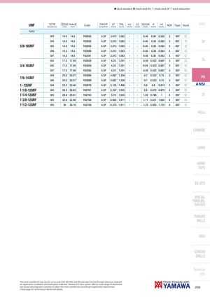 h stock standard, ) check stock EU, f check stock JP, m stock exhaustion UNF TCTR Ø Hole Ø(tolerance)(mm)(mm)CodeTHCHT(chamfer)LF(inch)THL(inch) LU(inch) LS DCON K(inch)(inch)(inch)LK(inch)NOFTypeStockIntro ANSI GH3 14.5 14.6 Y82626 4.5P 3.812 1.083 - - 0.48 0.36 0.562 3 007 f GH4 14.5 14.6 Y82636 4.5P 3.812 1.083 - - 0.48 0.36 0.562 3 007 f SP 5/8-18UNF GH5 14.5 14.6 Y82656 4.5P 3.812 1.083 - - 0.48 0.36 0.562 3 007 f GH6 14.5 14.6 Y82694 4.5P 3.812 1.083 - - 0.48 0.36 0.562 3 007 f GH7 14.5 14.6 Y82591 4.5P 3.812 1.083 - - 0.48 0.36 0.562 3 007 f GH3 17.5 17.59 Y82628 4.5P 4.25 1.201 - - 0.59 0.422 0.687 3 007 f SL 3/4-16UNF GH5 17.5 17.59 Y82658 4.5P 4.25 1.201 - - 0.59 0.422 0.687 3 007 f GH7 17.5 17.59 Y82592 4.5P 4.25 1.201 - - 0.59 0.422 0.687 3 007 f 7/8-14UNF GH4 20.5 20.57 Y82696 4.5P 4.687 1.339 - - 0.7 0.523 0.75 3 007 f PO GH6 20.5 20.57 Y82699 4.5P 4.687 1.339 - - 0.7 0.523 0.75 3 007 f 1 -12UNF GH4 23.3 23.46 Y82679 4.5P 5.125 1.496 - - 0.8 0.6 0.812 3 007 f ANSI 1 1/8-12UNF GH5 26.5 26.63 Y82701 4.5P 5.437 1.535 - - 0.9 0.672 0.875 4 007 f 1 1/4-12UNF GH5 29.6 29.81 Y82703 4.5P 5.75 1.535 - - 1.02 0.766 1 4 007 f ST 1 3/8-12UNF GH5 32.8 32.98 Y82706 4.5P 6.062 1.811 - - 1.11 0.831 1.062 4 007 f 1 1/2-12UNF GH5 36 36.16 Y82708 4.5P 6.375 1.811 - - 1.23 0.925 1.125 4 007 f ROLL CARBIDE LONG HAND TAPS EG (STI) SPECIAL THREADS, GAUGES THREAD MILLS DIES CENTER DRILLS Technical info The most suitable GH tap class to cut accurate 2B, 3B (UNJ) and 2B oversized internal threads tolerance, depends on application conditions and work-piece materials. Yamawa GH class system offers a wide range of alternative tap classes allowing each customer to select the most suitable one according to application requirement. 259 Check page 673 of Technical info for full details.