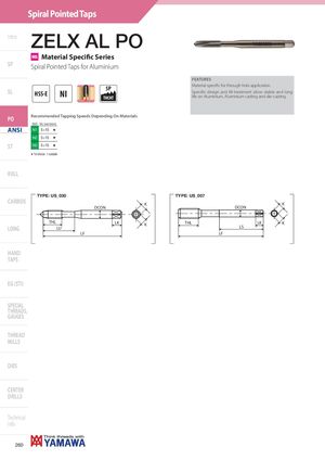 Spiral Pointed Taps Intro ZELX AL PO MS Material Specific Series SP Spiral Pointed Taps for Aluminium FEATURES SL HSS-E NI 5PTHCHT Material specific for through hole application.Specific design and NI treatment allow stable and longlife on Aluminium, Aluminium casting and die-casting. PO Recommended Tapping Speeds Depending On Materials ISO Vc (m/min) ANSI N1 5÷15 H N2 5÷15 H ST N3 5÷15 H H 1st choice I suitable ROLL ANSI-ZELX AL PO TYPE: US_030 TYPE: US_007 CARBIDE KDCON KDCON THLLONGLU LK K THL LK KLS LF LF HAND TAPS EG (STI) SPECIAL THREADS, GAUGES THREAD MILLS DIES CENTER DRILLS Technical info 260