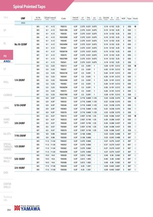 Spiral Pointed Taps Intro UNF TCTR Ø Hole Ø(tolerance)(mm)(mm)CodeTHCHT(chamfer)LF(inch)THL(inch) LU(inch) LS DCON K(inch)(inch)(inch)LK(inch)NOFTypeStock ANSI GH3 4.1 4.12 Y85510 4.5P 2.375 0.531 0.875 - 0.19 0.152 0.25 3 030 ) SP GH3 4.1 4.12 Y85510NI 4.5P 2.375 0.531 0.875 - 0.19 0.152 0.25 3 030 f GH4 4.1 4.12 Y85530 4.5P 2.375 0.531 0.875 - 0.19 0.152 0.25 3 030 f GH4 4.1 4.12 Y85530NI 4.5P 2.375 0.531 0.875 - 0.19 0.152 0.25 3 030 f GH5 4.1 4.12 Y85540 4.5P 2.375 0.531 0.875 - 0.19 0.152 0.25 3 030 f SL No.10-32UNF GH5 4.1 4.12 Y85540NI 4.5P 2.375 0.531 0.875 - 0.19 0.152 0.25 3 030 f GH6 4.1 4.12 Y85561 4.5P 2.375 0.531 0.875 - 0.19 0.152 0.25 3 030 f GH6 4.1 4.12 Y85561NI 4.5P 2.375 0.531 0.875 - 0.19 0.152 0.25 3 030 f PO GH7 4.1 4.12 Y85570 4.5P 2.375 0.531 0.875 - 0.19 0.152 0.25 3 030 f GH7 4.1 4.12 Y85570NI 4.5P 2.375 0.531 0.875 - 0.19 0.152 0.25 3 030 f ANSI GH2 4.1 4.12 Y85541 4.5P 2.375 0.531 0.875 - 0.19 0.152 0.25 3 030 f GH3 5.5 5.53 Y85514 4.5P 2.5 0.591 1 - 0.26 0.191 0.312 3 030 ) ST GH4 5.5 5.53 Y85531 4.5P 2.5 0.591 1 - 0.26 0.191 0.312 3 030 f GH4 5.5 5.53 Y85531NI 4.5P 2.5 0.591 1 - 0.26 0.191 0.312 3 030 f GH5 5.5 5.53 Y85544 4.5P 2.5 0.591 1 - 0.26 0.191 0.312 3 030 f ROLL 1/4-28UNF GH5 5.5 5.53 Y85544NI 4.5P 2.5 0.591 1 - 0.26 0.191 0.312 3 030 fGH65.55.53Y855624.5P2.50.5911-0.260.1910.3123030f GH6 5.5 5.53 Y85562NI 4.5P 2.5 0.591 1 - 0.26 0.191 0.312 3 030 f GH7 5.5 5.53 Y85574 4.5P 2.5 0.591 1 - 0.26 0.191 0.312 3 030 f CARBIDE GH7 5.5 5.53 Y85574NI 4.5P 2.5 0.591 1 - 0.26 0.191 0.312 3 030 f GH3 6.9 6.97 Y85516 4.5P 2.718 0.669 1.125 - 0.32 0.238 0.375 3 030 ) GH4 6.9 6.97 Y85532 4.5P 2.718 0.669 1.125 - 0.32 0.238 0.375 3 030 f 5/16-24UNF GH5 6.9 6.97 Y85546 4.5P 2.718 0.669 1.125 - 0.32 0.238 0.375 3 030 f LONG GH6 6.9 6.97 Y85563 4.5P 2.718 0.669 1.125 - 0.32 0.238 0.375 3 030 f GH7 6.9 6.97 Y85576 4.5P 2.718 0.669 1.125 - 0.32 0.238 0.375 3 030 f GH3 8.5 8.57 Y85518 4.5P 2.937 0.748 1.25 - 0.38 0.286 0.437 3 030 ) HAND GH4 8.5 8.57 Y85533 4.5P 2.937 0.748 1.25 - 0.38 0.286 0.437 3 030 f TAPS 3/8-24UNF GH5 8.5 8.57 Y85548 4.5P 2.937 0.748 1.25 - 0.38 0.286 0.437 3 030 f GH6 8.5 8.57 Y85564 4.5P 2.937 0.748 1.25 - 0.38 0.286 0.437 3 030 f GH7 8.5 8.57 Y85578 4.5P 2.937 0.748 1.25 - 0.38 0.286 0.437 3 030 f EG (STI) GH3 9.9 9.96 Y85520 4.5P 3.156 0.866 - - 0.32 0.242 0.406 3 007 f 7/16-20UNF GH5 9.9 9.96 Y85550 4.5P 3.156 0.866 - - 0.32 0.242 0.406 3 007 f GH3 11.5 11.54 Y85522 4.5P 3.375 0.984 - - 0.37 0.275 0.437 3 007 f SPECIAL GH5 11.5 11.54 Y85552 4.5P 3.375 0.984 - - 0.37 0.275 0.437 3 007 f THREADS, 1/2-20UNFGAUGES GH7 11.5 11.54 Y85582 4.5P 3.375 0.984 - - 0.37 0.275 0.437 3 007 f GH7 11.5 11.54 Y85582NI 4.5P 3.375 0.984 - - 0.37 0.275 0.437 3 007 f GH3 14.5 14.6 Y85526 4.5P 3.812 1.083 - - 0.48 0.36 0.562 3 007 f THREAD 5/8-18UNF GH5 14.5 14.6 Y85556 4.5P 3.812 1.083 - - 0.48 0.36 0.562 3 007 f MILLS GH7 14.5 14.6 Y85586 4.5P 3.812 1.083 - - 0.48 0.36 0.562 3 007 f GH3 17.5 17.59 Y85528 4.5P 4.25 1.201 - - 0.59 0.442 0.687 3 007 f 3/4-16UNF GH5 17.5 17.59 Y85558 4.5P 4.25 1.201 - - 0.59 0.442 0.687 3 007 f DIES CENTER DRILLS Technical info 264