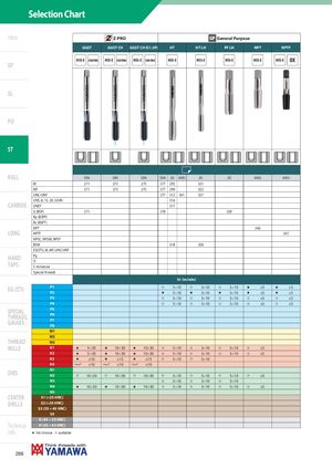 Selection Chart Intro Z-PRO GP General Purpose GGST GGST CH GGST CH E(1.5P) HT HT LH PF LH NPT NPTF HSS-E COATING HSS-E COATING HSS-E COATING HSS-E HSS-E HSS-E HSS-E HSS-E OX SP SL PO ST ROLL DIN DIN DIN DIN JIS ANSI JIS JIS ANSI ANSI M 271 273 275 277 295 321 MF 271 273 275 277 299 322 UNC/UNF 277 312 341 327 UNS, 8, 12, 20, 32UN 316 CARBIDE UNEF 317 G (BSP) 271 278 329 Rp (BSPP) Rc (BSPT) NPT 346 LONG NPTF 347 NPSC, NPSM, NPSF BSW 318 328 EG(STI), M, MF, UNC/UNF HAND Pg TAPS TrS miniature Special threads Vc (m/min) EG (STI) P1P2 I 5÷10 I 5÷10 I 5÷10 H ≤5 H ≤5H5÷10H5÷10H5÷10H≤5H≤5 P3 I 5÷10 I 5÷10 I 5÷10 I ≤5 I ≤5 P4 I 5÷10 I 5÷10 I 5÷10 I ≤5 I ≤5 SPECIALTHREADS,GAUGES P5P6P7P8 M1 M2 THREAD M3 MILLS K1 H 5÷20 H 10÷30 H 10÷30 I 5÷10 I 5÷10 I 5÷10 I ≤5 K2 H 5÷20 H 10÷30 H 10÷30 I 5÷10 I 5÷10 I 5÷10 I ≤5 K3 H ≤10 H ≤15 H ≤15 I 5÷10 I 5÷10 K4 ª10 ≤10 ª10 ≤10 ª10 ≤10 DIES N1N2 I 10÷20 I 10÷30 I 10÷30 I 5÷10 I 5÷10 I 5÷10 I ≤5 N3 I 5÷10 I 5÷10 I 5÷10 N4 H 10÷20 H 10÷30 H 10÷30 I 5÷10 I 5÷10 I 5÷10 I ≤5 N5 CENTER S1 (<25 HRC) DRILLS S2 (<35 HRC) S3 (35 ÷ 45 HRC) S5 H (45 ÷ 55 HRC) Technical H (55 ÷ 63 HRC) info H 1st choice I suitable 266