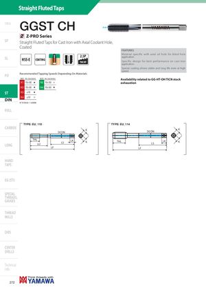 Straight Fluted Taps Intro GGST CH Z-PRO Series SP Straight Fluted Taps for Cast Iron with Axial Coolant Hole, Coated FEATURES SL HSS-E COATING 2.5PTHCHT Material specific with axial oil hole for blind holeapplication.Specific design for best performance on cast ironapplication. Special coating allows stable and long life even at high speed. PO Recommended Tapping Speeds Depending On Materials ISO Vc (m/min) ISO Vc (m/min) Availability related to GG-HT-OH TiCN stock K1 10÷30 H N2 10÷30 I exhaustion K2 10÷30 H N4 10÷30 H ST K3 ≤15 H K4 ≤10 I DIN H 1st choice I suitable ROLL DIN-GGST CH TYPE: EU_110 TYPE: EU_114 CARBIDE KDCON KDCON LONG THL LU LKLS K THL LKLS K LF LF HAND TAPS EG (STI) SPECIAL THREADS, GAUGES THREAD MILLS DIES CENTER DRILLS Technical info 272