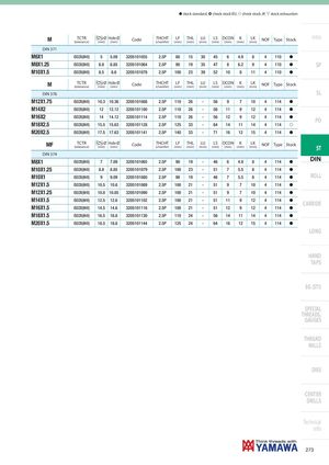 h stock standard, ) check stock EU, f check stock JP, m stock exhaustion M TCTR Ø Hole Ø(tolerance)(mm)(mm)CodeTHCHT(chamfer)LF(mm)THL(mm) LU(mm) LS DCON K(mm)(mm)(mm)LK(mm)NOFTypeStock Intro DIN 371 M6X1 ISO2X(6HX) 5 5.09 3205101055 2.5P 80 15 30 45 6 4.9 8 4 110 h M8X1.25 ISO2X(6HX) 6.8 6.85 3205101064 2.5P 90 19 35 47 8 6.2 9 4 110 h SP M10X1.5 ISO2X(6HX) 8.5 8.6 3205101078 2.5P 100 23 39 52 10 8 11 4 110 h M TCTR Ø Hole Ø(tolerance)(mm)(mm)CodeTHCHT(chamfer)LF(mm)THL(mm) LU(mm) LS DCON K(mm)(mm)(mm)LK(mm)NOFTypeStock DIN 376 SL M12X1.75 ISO2X(6HX) 10.3 10.36 3205101088 2.5P 110 26 - 56 9 7 10 4 114 h M14X2 ISO2X(6HX) 12 12.12 3205101100 2.5P 110 26 - 56 11 9 12 4 114 h M16X2 ISO2X(6HX) 14 14.12 3205101114 2.5P 110 26 - 56 12 9 12 4 114 h PO M18X2.5 ISO2X(6HX) 15.5 15.63 3205101128 2.5P 125 33 - 64 14 11 14 4 114 f M20X2.5 ISO2X(6HX) 17.5 17.63 3205101141 2.5P 140 33 - 71 16 12 15 4 114 h MF TCTR Ø Hole Ø(tolerance)(mm)(mm)CodeTHCHT(chamfer)LF(mm)THL(mm) LU(mm) LS DCON K(mm)(mm)(mm)LK(mm)NOFTypeStock ST DIN 374 M8X1 ISO2X(6HX) 7 7.09 3205101065 2.5P 90 19 - 46 6 4.9 8 4 114 h DIN M10X1.25 ISO2X(6HX) 8.8 8.85 3205101079 2.5P 100 23 - 51 7 5.5 8 4 114 h M10X1 ISO2X(6HX) 9 9.09 3205101080 2.5P 90 19 - 46 7 5.5 8 4 114 h ROLL M12X1.5 ISO2X(6HX) 10.5 10.6 3205101089 2.5P 100 21 - 51 9 7 10 4 114 h M12X1.25 ISO2X(6HX) 10.8 10.85 3205101090 2.5P 100 21 - 51 9 7 10 4 114 h M14X1.5 ISO2X(6HX) 12.5 12.6 3205101102 2.5P 100 21 - 51 11 9 12 4 114 h CARBIDE M16X1.5 ISO2X(6HX) 14.5 14.6 3205101116 2.5P 100 21 - 51 12 9 12 4 114 h M18X1.5 ISO2X(6HX) 16.5 16.6 3205101130 2.5P 110 24 - 56 14 11 14 4 114 h M20X1.5 ISO2X(6HX) 18.5 18.6 3205101144 2.5P 125 24 - 64 16 12 15 4 114 h LONG HAND TAPS EG (STI) SPECIAL THREADS, GAUGES THREAD MILLS DIES CENTER DRILLS Technical info 273
