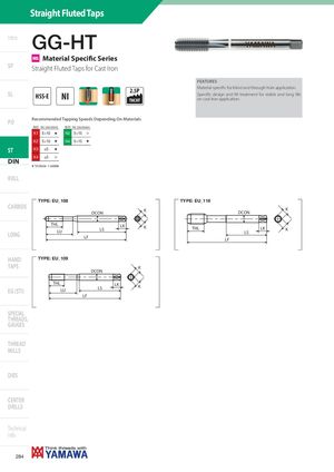 Straight Fluted Taps Intro GG-HT MS Material Specific Series SP Straight Fluted Taps for Cast Iron FEATURES SL HSS-E NI 2.5P Material specific for blind and through hole application.Specific design and NI treatment for stable and long lifeTHCHTon cast iron application. PO Recommended Tapping Speeds Depending On Materials ISO Vc (m/min) ISO Vc (m/min) K1 5÷10 H N2 5÷15 I K2 5÷10 H N4 5÷15 H ST K3 ≤5 H K4 ≤5 I DIN H 1st choice I suitable ROLL DIN-GG-HT TYPE: EU_108 TYPE: EU_116 CARBIDE DCON K KDCON LONG THLLU LKLS KLF THL LKLS KLF HAND TYPE: EU_109 TAPS K DCON THLEG (STI) LU LKLS K LF SPECIAL THREADS, GAUGES THREAD MILLS DIES CENTER DRILLS Technical info 284