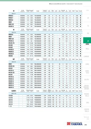 h stock standard, ) check stock EU, f check stock JP, m stock exhaustion M TCTR Ø Hole Ø(tolerance)(mm)(mm)CodeTHCHT(chamfer)LF(mm)THL(mm) LU(mm) LS DCON K(mm)(mm)(mm)LK(mm)NOFTypeStock Intro DIN 371 M3X0.5 ISO2X(6HX) 2.5 2.56 TD3.0GBAENC 2.5P 56 9 18 34 3.5 2.7 6 3 108 h M4X0.7 ISO2X(6HX) 3.3 3.38 TD4.0IBAENC 2.5P 63 13 21 38 4.5 3.4 6 4 108 h SP M5X0.8 ISO2X(6HX) 4.2 4.28 TD5.0KBAENC 2.5P 70 14 25 39 6 4.9 8 4 108 h M6X1 ISO2X(6HX) 5 5.09 TD6.0MBAENC 2.5P 80 15 30 45 6 4.9 8 4 108 h M8X1.25 ISO2X(6HX) 6.8 6.85 TD8.0NBAENC 2.5P 90 19 35 47 8 6.2 9 4 109 h M10X1.5 ISO2X(6HX) 8.5 8.6 TD010OBAENC 2.5P 100 23 39 52 10 8 11 4 109 h SL M TCTR Ø Hole Ø(tolerance)(mm)(mm)CodeTHCHT(chamfer)LF(mm)THL(mm) LU(mm) LS DCON K(mm)(mm)(mm)LK(mm)NOFTypeStock DIN 376 PO M5X0.8 ISO2X(6HX) 4.2 4.28 TG5.0KBAENC 2.5P 70 14 - - 3.5 2.7 6 4 116 f M6X1 ISO2X(6HX) 5 5.09 TG6.0MBAENC 2.5P 80 15 - - 4.5 3.4 6 4 116 f M8X1.25 ISO2X(6HX) 6.8 6.85 TG8.0NBAENC 2.5P 90 19 - 46 6 4.9 8 4 116 h M10X1.5 ISO2X(6HX) 8.5 8.6 TG010OBAENC 2.5P 100 23 - 51 7 5.5 8 4 116 h ST M12X1.75M14X2 ISO2X(6HX) 10.3 10.36 TG012PBAENC 2.5P 110 26 - 56 9 7 10 4 116 hISO2X(6HX)1212.12TG014QBAENC2.5P11026-56119124116hDIN M16X2 ISO2X(6HX) 14 14.12 TG016QBAENC 2.5P 110 26 - 56 12 9 12 4 116 h M18X2.5 ISO2X(6HX) 15.5 15.63 TG018RBAENC 2.5P 125 33 - 64 14 11 14 4 116 h ROLL M20X2.5 ISO2X(6HX) 17.5 17.63 TG020RBAENC 2.5P 140 33 - 71 16 12 15 4 116 h M22X2.5 ISO2X(6HX) 19.5 19.63 TG022RBAENC 2.5P 140 33 - 71 18 14.5 17 4 116 h M24X3 ISO2X(6HX) 21 21.13 TG024SBAENC 2.5P 160 37 - 82 18 14.5 17 4 116 h CARBIDE MF TCTR Ø Hole Ø(tolerance)(mm)(mm)CodeTHCHT(chamfer)LF(mm)THL(mm) LU(mm) LS DCON K(mm)(mm)(mm)LK(mm)NOFTypeStock DIN 374 M8X1 ISO2X(6HX) 7 7.09 TM8.0MBAENC 2.5P 90 19 - 46 6 4.9 8 4 116 h LONG M10X1.25 ISO2X(6HX) 8.8 8.85 TM010NBAENC 2.5P 100 23 - 51 7 5.5 8 4 116 h M10X1 ISO2X(6HX) 9 9.09 TM010MBAENC 2.5P 90 19 - 46 7 5.5 8 4 116 h M12X1.5 ISO2X(6HX) 10.5 10.6 TM012OBAENC 2.5P 100 21 - 51 9 7 10 4 116 h HAND M12X1.25 ISO2X(6HX) 10.8 10.85 TM012NBAENC 2.5P 100 21 - 51 9 7 10 4 116 h TAPS M12X1 ISO2X(6HX) 11 11.09 TM012MBAENC 2.5P 100 21 - 51 9 7 10 4 116 h M14X1.5 ISO2X(6HX) 12.5 12.6 TM014OBAENC 2.5P 100 21 - 51 11 9 12 4 116 h M16X1.5 ISO2X(6HX) 14.5 14.6 TM016OBAENC 2.5P 100 21 - 51 12 9 12 4 116 h EG (STI) M18X1.5 ISO2X(6HX) 16.5 16.6 TM018OBAENC 2.5P 110 24 - 56 14 11 14 4 116 h M20X1.5 ISO2X(6HX) 18.5 18.6 TM020OBAENC 2.5P 125 24 - 64 16 12 15 4 116 h M22X1.5 ISO2X(6HX) 20.5 20.6 TM022OBAENC 2.5P 125 24 - 64 18 14.5 17 4 116 h SPECIAL M24X1.5 ISO2X(6HX) 22.5 22.6 TM024OBAENC 2.5P 140 27 - 71 18 14.5 17 4 116 h THREADS, GAUGES G(BSP) TCTR Ø Hole Ø(tolerance)(mm)(mm)CodeTHCHT(chamfer)Basicmajor Ø(mm)LF(mm)THL(mm)LSDCON K(mm)(mm)(mm)LK(mm)NOFTypeStock DIN 5156 THREAD 1/8-28 - 8.75 8.78 TVG0020AENC 2.5P 9.728 90 19 46 7 5.5 8 4 116 h MILLS 1/4-19 - 11.75 11.78 TVG0040AENC 2.5P 13.157 100 21 51 11 9 12 4 116 h 3/8-19 - 15.25 15.28 TVG0060AENC 2.5P 16.662 100 21 51 12 9 12 4 116 h 1/2-14 - 19 19.04 TVG0080AENC 2.5P 20.955 125 24 64 16 12 15 4 116 h DIES 3/4-14 - 24.5 24.52 TVG0120AENC 2.5P 26.441 140 27 71 20 16 19 4 116 h 1 -11 - 30.75 30.77 TVG0160AENC 2.5P 33.249 160 29 82 25 20 23 4 116 h CENTER DRILLS Technical info 285