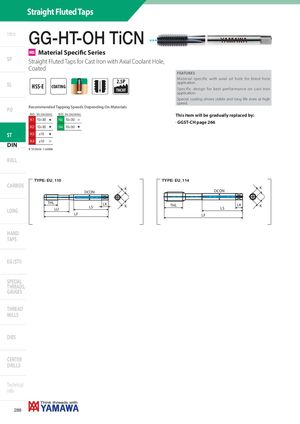 Straight Fluted Taps Intro GG-HT-OH TiCN MS Material Specific Series SP Straight Fluted Taps for Cast Iron with Axial Coolant Hole, Coated FEATURES SL HSS-E COATING 2.5PTHCHT Material specific with axial oil hole for blind holeapplication.Specific design for best performance on cast ironapplication. Special coating allows stable and long life even at high speed. PO Recommended Tapping Speeds Depending On Materials ISO Vc (m/min) ISO Vc (m/min) This item will be gradually replaced by: K1 10÷30 H N2 10÷30 I . GGST-CH page 266 K2 10÷30 H N4 10÷30 H ST K3 ≤15 H K4 ≤10 I DIN H 1st choice I suitable ROLL DIN-GG-HT-OH TiCN TYPE: EU_110 TYPE: EU_114 CARBIDE KDCON KDCON LONG THL LU LKLS K THL LKLS K LF LF HAND TAPS EG (STI) SPECIAL THREADS, GAUGES THREAD MILLS DIES CENTER DRILLS Technical info 288