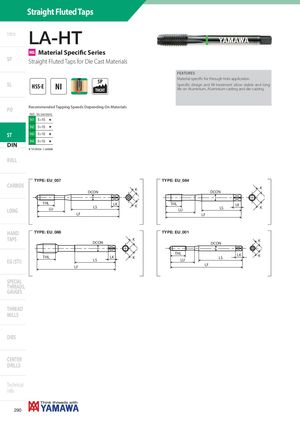 Straight Fluted Taps Intro LA-HT MS Material Specific Series SP Straight Fluted Taps for Die Cast Materials FEATURES SL HSS-E NI 5PTHCHT Material specific for through hole application.Specific design and NI treatment allow stable and longlife on Aluminium, Aluminium casting and die-casting. PO Recommended Tapping Speeds Depending On Materials ISO Vc (m/min) N1 5÷15 H N2 5÷15 H ST N3 5÷10 H N4 5÷10 H DIN H 1st choice I suitable ROLL DIN-LA-HT TYPE: EU_057 TYPE: EU_084 CARBIDE DCON K KDCON THLLONGLU LKLS K THL LU LKLS K LF LF HAND TYPE: EU_086 TYPE: EU_001 TAPS KDCON DCON K THLEG (STI) LKLS K THLLU LKLS K LF LF SPECIAL THREADS, GAUGES THREAD MILLS DIES CENTER DRILLS Technical info 290