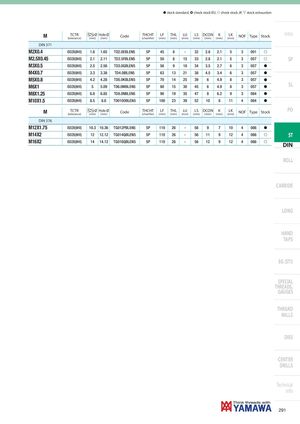 h stock standard, ) check stock EU, f check stock JP, m stock exhaustion M TCTR Ø Hole Ø(tolerance)(mm)(mm)CodeTHCHT(chamfer)LF(mm)THL(mm) LU(mm) LS DCON K(mm)(mm)(mm)LK(mm)NOFTypeStock Intro DIN 371 M2X0.4 ISO2X(6HX) 1.6 1.65 TD2.0EBLEN5 5P 45 8 - 32 2.8 2.1 5 3 001 f M2.5X0.45 ISO2X(6HX) 2.1 2.11 TD2.5FBLEN5 5P 50 8 15 33 2.8 2.1 5 3 057 f SP M3X0.5 ISO2X(6HX) 2.5 2.56 TD3.0GBLEN5 5P 56 9 18 34 3.5 2.7 6 3 057 h M4X0.7 ISO2X(6HX) 3.3 3.38 TD4.0IBLEN5 5P 63 13 21 38 4.5 3.4 6 3 057 h M5X0.8 ISO2X(6HX) 4.2 4.28 TD5.0KBLEN5 5P 70 14 25 39 6 4.9 8 3 057 h M6X1 ISO2X(6HX) 5 5.09 TD6.0MBLEN5 5P 80 15 30 45 6 4.9 8 3 057 h SL M8X1.25 ISO2X(6HX) 6.8 6.85 TD8.0NBLEN5 5P 90 19 35 47 8 6.2 9 3 084 h M10X1.5 ISO2X(6HX) 8.5 8.6 TD010OBLEN5 5P 100 23 39 52 10 8 11 4 084 h M TCTR Ø Hole Ø(tolerance)(mm)(mm)CodeTHCHT(chamfer)LF(mm)THL(mm) LU(mm) LS DCON K(mm)(mm)(mm)LK(mm)NOFTypeStock PO DIN 376 M12X1.75 ISO2X(6HX) 10.3 10.36 TG012PBLEN5 5P 110 26 - 56 9 7 10 4 086 h M14X2 ISO2X(6HX) 12 12.12 TG014QBLEN5 5P 110 26 - 56 11 9 12 4 086 f ST M16X2 ISO2X(6HX) 14 14.12 TG016QBLEN5 5P 110 26 - 56 12 9 12 4 086 f DIN ROLL CARBIDE LONG HAND TAPS EG (STI) SPECIAL THREADS, GAUGES THREAD MILLS DIES CENTER DRILLS Technical info 291