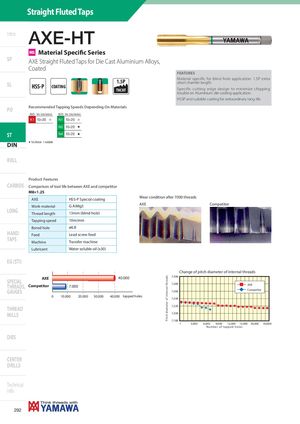 Straight Fluted Taps Intro AXE-HT MS Material Specific Series SP AXE Straight Fluted Taps for Die Cast Aluminium Alloys, Coated FEATURES SL HSS-P COATING 1.5PTHCHT Material specific for blind hole application. 1.5P extrashort chamfer length.Specific cutting edge design to minimize chippingtrouble on Aluminium die-casting application. HSSP and suitable coating for extraordinary long life. PO Recommended Tapping Speeds Depending On Materials ISO Vc (m/min) ISO Vc (m/min) K1 10÷20 I N1 10÷20 I N2 10÷20 H ST N4 10÷20 H DIN H 1st choice I suitable ROLL DIN-AXE-HT Product Features CARBIDE Comparison of tool life between AXE and competitor M8×1.25 AXE HSS-P Special coating Wear condition after 7000 threads Work-material G-AIMg5 AXE Competitor LONG Thread length 13mm (blind hole) Tapping speed 10m/min Bored hole ø6.8 HAND Feed Lead screw feed TAPS Machine Transfer machine Lubricant Water soluble oil (x30) EG (STI) Change of pitch diameter of internal threads SPECIAL AXE 40.000THREADS,Competitor7.000 7.3087.288 AXE GAUGES 7.268 Competitor 0 10.000 20.000 30.000 40.000 tapped holes 7.248 THREAD 7.228 MILLS 7.208 7.188 1 3,000 6,000 9,000 12,000 15,000 30,000 40,000 Number of tapped holes DIES CENTER DRILLS Technical info 292 Pitch diameter of internal threads