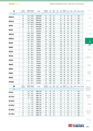 Oversized h stock standard, ) check stock EU, f check stock JP, m stock exhaustion M TCTR Ø Hole Ø(tolerance)(mm)(mm)CodeTHCHT(chamfer)LF(mm)THL(mm) LU(mm) LS DCON K(mm)(mm)(mm)LK(mm)NOFTypeStock Intro JIS P5 37.5 37.63 TNMT042V5 5P 175 59 - 81 32 26 30 4 002 f M42X4.5 P5 37.5 37.63 TNMT042V1 1.5P 175 59 - 81 32 26 30 4 002 f SP P5 40.5 40.63 TNMT045V5 5P 180 59 - 83 35 26 30 4 002 f M45X4.5 P5 40.5 40.63 TNMT045V1 1.5P 180 59 - 83 35 26 30 4 002 f P5 43 43.12 TNMT048W5 5P 185 65 - 85 38 29 32 4 002 f M48X5 P5 43 43.12 TNMT048W1 1.5P 185 65 - 85 38 29 32 4 002 f SL II 47 47.1 TH2052W5 5P 195 90 - 105 42 32 35 4 002 f M52X5 II 47 47.1 TH2052W1 1.5P 195 90 - 105 42 32 35 4 002 f M56X5.5 II 50.5 50.6 TH2056X5 5P 205 95 - 110 44 35 38 4 002 f PO II 50.5 50.6 TH2056X1 1.5P 205 95 - 110 44 35 38 4 002 f II 54.5 54.6 TH2060X5 5P 215 100 - 115 46 35 38 4 002 f M60X5.5 II 54.5 54.6 TH2060X1 1.5P 215 100 - 115 46 35 38 4 002 f II 58 58.1 TH2064Y5 5P 225 105 - 120 48 38 42 4 002 f ST M64X6 II 58 58.1 TH2064Y1 1.5P 225 105 - 120 48 38 42 4 002 f JIS II 62 62.1 TH2068Y5 5P 235 110 - 125 52 41 44 4 002 f M68X6 II 62 62.1 TH2068Y1 1.5P 235 110 - 125 52 41 44 4 002 f II 64 64.1 TH2070Y5 5P 240 115 - 125 55 41 44 4 002 f ROLL M70X6 II 64 64.1 TH2070Y1 1.5P 240 115 - 125 55 41 44 4 002 f II 66 66.1 TH2072Y5 5P 240 115 - 125 55 41 44 4 002 f M72X6 II 66 66.1 TH2072Y1 1.5P 240 115 - 125 55 41 44 4 002 f CARBIDE II 70 70.1 TH2076Y5 5P 240 115 - 125 58 46 50 4 002 f M76X6 II 70 70.1 TH2076Y1 1.5P 240 115 - 125 58 46 50 4 002 f II 74 74.1 TH2080Y5 5P 245 115 - 130 58 46 50 6 002 f M80X6 II 74 74.1 TH2080Y1 1.5P 245 115 - 130 58 46 50 6 002 f LONG II 79 79.1 TH2085Y5 5P 245 115 - 130 60 46 50 6 002 f M85X6 II 79 79.1 TH2085Y1 1.5P 245 115 - 130 60 46 50 6 002 f II 84 84.1 TH2090Y5 5P 250 120 - 130 60 46 50 6 002 f HAND M90X6 II 84 84.1 TH2090Y1 1.5P 250 120 - 130 60 46 50 6 002 f TAPS II 89 89.1 TH2095Y5 5P 250 120 - 130 65 50 52 6 002 f M95X6 II 89 89.1 TH2095Y1 1.5P 250 120 - 130 65 50 52 6 002 f II 94 94.1 TH2100Y5 5P 250 120 - 130 65 50 52 6 002 f EG (STI) M100X6 II 94 94.1 TH2100Y1 1.5P 250 120 - 130 65 50 52 6 002 f MF TCTR Ø Hole Ø(tolerance)(mm)(mm)CodeTHCHT(chamfer)LF(mm)THL(mm) LU(mm) LS DCON K(mm)(mm)(mm)LK(mm)NOFTypeStock SPECIAL JIS THREADS,GAUGES P1 0.8 0.81 TNMP1.0A5 5P 36 3.6 - 24 3 2.5 5 3 005 f M1X0.2 P1 0.8 0.81 TNMP1.0A1 1.5P 36 3.6 - 24 3 2.5 5 3 005 f P1 0.9 0.91 TNMP1.1A5 5P 36 3.6 - 24 3 2.5 5 3 005 f THREAD M1.1X0.2 P1 0.9 0.91 TNMP1.1A1 1.5P 36 3.6 - 24 3 2.5 5 3 005 f MILLS P1 1 1.01 TNMP1.2A5 5P 36 3.6 - 24 3 2.5 5 3 005 f M1.2X0.2 P1 1 1.01 TNMP1.2A1 1.5P 36 3.6 - 24 3 2.5 5 3 005 f M1.4X0.2 P1 1.2 1.21 TNMP1.4A5 5P 36 3.6 - 24 3 2.5 5 3 005 f DIES P1 1.2 1.21 TNMP1.4A1 1.5P 36 3.6 - 24 3 2.5 5 3 005 f P1 1.4 1.41 TNMP1.6A5 5P 36 3.6 - 24 3 2.5 5 3 005 f M1.6X0.2 P1 1.4 1.41 TNMP1.6A1 1.5P 36 3.6 - 24 3 2.5 5 3 005 f CENTER M1.7X0.2 P1 1.5 1.51 TNMP1.7A5 5P 36 3.6 - 24 3 2.5 5 3 005 f DRILLS P1 1.5 1.51 TNMP1.7A1 1.5P 36 3.6 - 24 3 2.5 5 3 005 f Technical info 299
