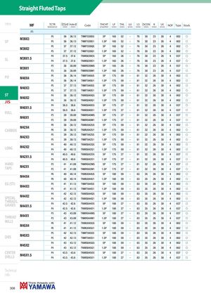 Straight Fluted Taps Intro MF TCTR Ø Hole Ø(tolerance)(mm)(mm)CodeTHCHT(chamfer)LF(mm)THL(mm) LU(mm) LS DCON K(mm)(mm)(mm)LK(mm)NOFTypeStock JIS P5 36 36.13 TNMT039S5 5P 165 52 - 76 30 23 26 4 002 f M39X3 SP P5 36 36.13 TNMT039S1 1.5P 165 52 - 76 30 23 26 4 002 f P5 37 37.12 TNMT039Q5 5P 165 52 - 76 30 23 26 4 002 f M39X2 P5 37 37.12 TNMT039Q1 1.5P 165 52 - 76 30 23 26 4 002 f P4 37.5 37.6 TNMS039O5 5P 165 26 - 76 30 23 26 4 037 f SL M39X1.5 P4 37.5 37.6 TNMS039O1 1.5P 165 26 - 76 30 23 26 4 037 f P3 38 38.09 TNMR039M5 5P 165 26 - 76 30 23 26 4 037 f M39X1 P3 38 38.09 TNMR039M1 1.5P 165 26 - 76 30 23 26 4 037 f PO M40X4 P5 36 36.14 TNMT040U5 5P 175 59 - 81 32 26 30 4 002 f P5 36 36.14 TNMT040U1 1.5P 175 59 - 81 32 26 30 4 002 f P5 37 37.13 TNMT040S5 5P 175 59 - 81 32 26 30 4 002 f M40X3 P5 37 37.13 TNMT040S1 1.5P 175 59 - 81 32 26 30 4 002 f ST P4 38 38.12 TNMS040Q5 5P 175 59 - 81 32 26 30 4 002 f M40X2 JIS P4 38 38.12 TNMS040Q1 1.5P 175 59 - 81 32 26 30 4 002 f P4 38.5 38.6 TNMS040O5 5P 175 27 - 81 32 26 30 4 037 f M40X1.5 P4 38.5 38.6 TNMS040O1 1.5P 175 27 - 81 32 26 30 4 037 f ROLL P3 39 39.09 TNMR040M5 5P 175 27 - 81 32 26 30 4 037 f M40X1 P3 39 39.09 TNMR040M1 1.5P 175 27 - 81 32 26 30 4 037 f P6 38 38.12 TNMU042U5 5P 175 59 - 81 32 26 30 4 002 f M42X4 CARBIDE P6 38 38.12 TNMU042U1 1.5P 175 59 - 81 32 26 30 4 002 f P5 39 39.13 TNMT042S5 5P 175 59 - 81 32 26 30 4 002 f M42X3 P5 39 39.13 TNMT042S1 1.5P 175 59 - 81 32 26 30 4 002 f P4 40 40.12 TNMS042Q5 5P 175 59 - 81 32 26 30 4 002 f LONG M42X2 P4 40 40.12 TNMS042Q1 1.5P 175 59 - 81 32 26 30 4 002 f P4 40.5 40.6 TNMS042O5 5P 175 27 - 81 32 26 30 4 037 f M42X1.5 P4 40.5 40.6 TNMS042O1 1.5P 175 27 - 81 32 26 30 4 037 f HAND P3 41 41.09 TNMR042M5 5P 175 27 - 81 32 26 30 4 037 f TAPS M42X1 P3 41 41.09 TNMR042M1 1.5P 175 27 - 81 32 26 30 4 037 f P6 40 40.14 TNMU044U5 5P 180 59 - 83 35 26 30 4 002 f M44X4 P6 40 40.14 TNMU044U1 1.5P 180 59 - 83 35 26 30 4 002 f EG (STI) P5 41 41.13 TNMT044S5 5P 180 59 - 83 35 26 30 4 002 f M44X3 P5 41 41.13 TNMT044S1 1.5P 180 59 - 83 35 26 30 4 002 f P4 42 42.12 TNMS044Q5 5P 180 59 - 83 35 26 30 4 002 f SPECIAL M44X2 P4 42 42.12 TNMS044Q1 1.5P 180 59 - 83 35 26 30 4 002 f THREADS,GAUGESM44X1.5 P4 42.5 42.6 TNMS044O5 5P 180 27 - 83 35 26 30 4 037 f P4 42.5 42.6 TNMS044O1 1.5P 180 27 - 83 35 26 30 4 037 f P3 43 43.09 TNMR044M5 5P 180 27 - 83 35 26 30 4 037 f THREAD M44X1 P3 43 43.09 TNMR044M1 1.5P 180 27 - 83 35 26 30 4 037 f MILLS P6 41 41.12 TNMU045U5 5P 180 59 - 83 35 26 30 4 002 f M45X4 P6 41 41.12 TNMU045U1 1.5P 180 59 - 83 35 26 30 4 002 f P5 42 42.13 TNMT045S5 5P 180 59 - 83 35 26 30 4 002 f DIES M45X3 P5 42 42.13 TNMT045S1 1.5P 180 59 - 83 35 26 30 4 002 f P4 43 43.12 TNMS045Q5 5P 180 59 - 83 35 26 30 4 002 f M45X2 P4 43 43.12 TNMS045Q1 1.5P 180 59 - 83 35 26 30 4 002 f CENTERDRILLSM45X1.5 P4 43.5 43.6 TNMS045O5 5P 180 27 - 83 35 26 30 4 037 fP443.543.6TNMS045O11.5P18027-833526304037f Technical info 308