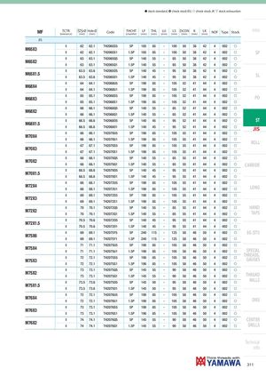 h stock standard, ) check stock EU, f check stock JP, m stock exhaustion MF TCTR Ø Hole Ø(tolerance)(mm)(mm)CodeTHCHT(chamfer)LF(mm)THL(mm) LU(mm) LS DCON K(mm)(mm)(mm)LK(mm)NOFTypeStock Intro JIS II 62 62.1 TH2065S5 5P 185 85 - 100 50 38 42 4 002 f M65X3 II 62 62.1 TH2065S1 1.5P 185 85 - 100 50 38 42 4 002 f SP II 63 63.1 TH2065Q5 5P 140 55 - 85 50 38 42 4 002 f M65X2 II 63 63.1 TH2065Q1 1.5P 140 55 - 85 50 38 42 4 002 f II 63.5 63.6 TH2065O5 5P 140 45 - 95 50 38 42 4 002 f M65X1.5 II 63.5 63.6 TH2065O1 1.5P 140 45 - 95 50 38 42 4 002 f SL II 64 64.1 TH2068U5 5P 190 85 - 105 52 41 44 4 002 f M68X4 II 64 64.1 TH2068U1 1.5P 190 85 - 105 52 41 44 4 002 f M68X3 II 65 65.1 TH2068S5 5P 190 85 - 105 52 41 44 4 002 f PO II 65 65.1 TH2068S1 1.5P 190 85 - 105 52 41 44 4 002 f II 66 66.1 TH2068Q5 5P 140 55 - 85 52 41 44 4 002 f M68X2 II 66 66.1 TH2068Q1 1.5P 140 55 - 85 52 41 44 4 002 f II 66.5 66.6 TH2068O5 5P 140 45 - 95 52 41 44 4 002 f ST M68X1.5 II 66.5 66.6 TH2068O1 1.5P 140 45 - 95 52 41 44 4 002 f JIS II 66 66.1 TH2070U5 5P 190 85 - 105 55 41 44 4 002 f M70X4 II 66 66.1 TH2070U1 1.5P 190 85 - 105 55 41 44 4 002 f II 67 67.1 TH2070S5 5P 190 85 - 105 55 41 44 4 002 f ROLL M70X3 II 67 67.1 TH2070S1 1.5P 190 85 - 105 55 41 44 4 002 f II 68 68.1 TH2070Q5 5P 140 55 - 85 55 41 44 4 002 f M70X2 II 68 68.1 TH2070Q1 1.5P 140 55 - 85 55 41 44 4 002 f CARBIDE II 68.5 68.6 TH2070O5 5P 140 45 - 95 55 41 44 4 002 f M70X1.5 II 68.5 68.6 TH2070O1 1.5P 140 45 - 95 55 41 44 4 002 f II 68 68.1 TH2072U5 5P 190 85 - 105 55 41 44 4 002 f M72X4 II 68 68.1 TH2072U1 1.5P 190 85 - 105 55 41 44 4 002 f LONG II 69 69.1 TH2072S5 5P 190 85 - 105 55 41 44 4 002 f M72X3 II 69 69.1 TH2072S1 1.5P 190 85 - 105 55 41 44 4 002 f II 70 70.1 TH2072Q5 5P 140 55 - 85 55 41 44 4 002 f HAND M72X2 II 70 70.1 TH2072Q1 1.5P 140 55 - 85 55 41 44 4 002 f TAPS II 70.5 70.6 TH2072O5 5P 140 45 - 95 55 41 44 4 002 f M72X1.5 II 70.5 70.6 TH2072O1 1.5P 140 45 - 95 55 41 44 4 002 f II 69 69.1 TH2075Y5 5P 240 115 - 125 58 46 50 4 002 f EG (STI) M75X6 II 69 69.1 TH2075Y1 1.5P 240 115 - 125 58 46 50 4 002 f II 71 71.1 TH2075U5 5P 190 85 - 105 58 46 50 4 002 f M75X4 II 71 71.1 TH2075U1 1.5P 190 85 - 105 58 46 50 4 002 f SPECIAL M75X3 II 72 72.1 TH2075S5 5P 190 85 - 105 58 46 50 4 002 f THREADS,GAUGES II 72 72.1 TH2075S1 1.5P 190 85 - 105 58 46 50 4 002 f II 73 73.1 TH2075Q5 5P 145 55 - 90 58 46 50 4 002 f M75X2 II 73 73.1 TH2075Q1 1.5P 145 55 - 90 58 46 50 4 002 f THREAD II 73.5 73.6 TH2075O5 5P 145 50 - 95 58 46 50 4 002 f MILLS M75X1.5 II 73.5 73.6 TH2075O1 1.5P 145 50 - 95 58 46 50 4 002 f II 72 72.1 TH2076U5 5P 190 85 - 105 58 46 50 4 002 f M76X4 II 72 72.1 TH2076U1 1.5P 190 85 - 105 58 46 50 4 002 f DIES II 73 73.1 TH2076S5 5P 190 85 - 105 58 46 50 4 002 f M76X3 II 73 73.1 TH2076S1 1.5P 190 85 - 105 58 46 50 4 002 f M76X2 II 74 74.1 TH2076Q5 5P 145 55 - 90 58 46 50 4 002 f CENTERII7474.1TH2076Q11.5P14555-905846504002fDRILLS Technical info 311