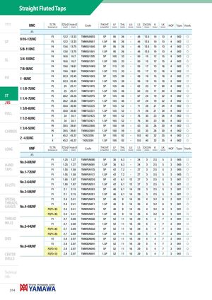 Straight Fluted Taps Intro UNC TCTR Ø Hole Ø(tolerance)(mm)(mm)CodeTHCHT(chamfer)LF(mm)THL(mm) LU(mm) LS DCON K(mm)(mm)(mm)LK(mm)NOFTypeStock JIS P3 12.2 12.33 TNMRU09S5 5P 95 26 - 48 12.5 10 13 4 002 f 9/16-12UNC SP P3 12.2 12.33 TNMRU09S1 1.5P 95 26 - 48 12.5 10 13 4 002 f P4 13.6 13.75 TNMSU10U5 5P 95 26 - 48 12.5 10 13 4 002 f 5/8-11UNC P4 13.6 13.75 TNMSU10U1 1.5P 95 26 - 48 12.5 10 13 4 002 f P4 16.6 16.7 TNMSU12V5 5P 105 33 - 50 15 12 15 4 002 f SL 3/4-10UNC P4 16.6 16.7 TNMSU12V1 1.5P 105 33 - 50 15 12 15 4 002 f P4 19.6 19.61 TNMSU14W5 5P 115 33 - 55 17 13 16 4 002 f 7/8-9UNC P4 19.6 19.61 TNMSU14W1 1.5P 115 33 - 55 17 13 16 4 002 f PO 1 -8UNC P4 22.3 22.45 TNMSU16X5 5P 125 39 - 58 19 15 18 4 002 f P4 22.3 22.45 TNMSU16X1 1.5P 125 39 - 58 19 15 18 4 002 f P5 25 25.17 TNMTU18Y5 5P 135 46 - 62 23 17 20 4 002 f 1 1/8-7UNC P5 25 25.17 TNMTU18Y1 1.5P 135 46 - 62 23 17 20 4 002 f ST P5 28.2 28.35 TNMTU20Y5 5P 145 46 - 67 24 19 22 4 002 f 1 1/4-7UNC JIS P5 28.2 28.35 TNMTU20Y1 1.5P 145 46 - 67 24 19 22 4 002 f P5 30.8 30.92 TNMTU22Z5 5P 155 52 - 71 28 21 24 4 002 f 1 3/8-6UNC P5 30.8 30.92 TNMTU22Z1 1.5P 155 52 - 71 28 21 24 4 002 f ROLL P5 34 34.1 TNMTU24Z5 5P 165 52 - 76 30 23 26 4 002 f 1 1/2-6UNC P5 34 34.1 TNMTU24Z1 1.5P 165 52 - 76 30 23 26 4 002 f P6 39.5 39.61 TNMUU2805 5P 180 59 - 83 35 26 30 4 002 f 1 3/4-5UNC CARBIDE P6 39.5 39.61 TNMUU2801 1.5P 180 59 - 83 35 26 30 4 002 f II 45.2 45.37 TH2U3295 5P 195 92 - 103 40 32 35 4 002 f 2 -4.5UNC II 45.2 45.37 TH2U3291 1.5P 195 92 - 103 40 32 35 4 002 f LONG UNF TCTR Ø Hole Ø(tolerance)(mm)(mm)CodeTHCHT(chamfer)LF(mm)THL(mm) LU(mm) LS DCON K(mm)(mm)(mm)LK(mm)NOFTypeStock JIS P1 1.25 1.27 TNMPUN0B5 5P 36 6.3 - 24 3 2.5 5 3 005 f No.0-80UNF HAND P1 1.25 1.27 TNMPUN0B1 1.5P 36 6.3 - 24 3 2.5 5 3 005 f TAPS P1 1.55 1.58 TNMPUN1C5 5P 42 7.2 - 27 3 2.5 5 3 005 f No.1-72UNF P1 1.55 1.58 TNMPUN1C1 1.5P 42 7.2 - 27 3 2.5 5 3 005 f P1 1.85 1.87 TNMPUN2D5 5P 42 8.1 12 27 3 2.5 5 3 001 f No.2-64UNF EG (STI) P1 1.85 1.87 TNMPUN2D1 1.5P 42 8.1 12 27 3 2.5 5 3 001 f P1 2.1 2.15 TNMPUN3E5 5P 46 8.1 14 29 3 2.5 5 3 001 f No.3-56UNF P1 2.1 2.15 TNMPUN3E1 1.5P 46 8.1 14 29 3 2.5 5 3 001 f SPECIAL P1 2.4 2.41 TNMPUN4F5 5P 46 9 14 26 4 3.2 6 3 001 f THREADS,GAUGESNo.4-48UNF P1 2.4 2.41 TNMPUN4F1 1.5P 46 9 14 26 4 3.2 6 3 001 f P3(P1+30) 2.4 2.41 TNMRUN4F5 5P 46 9 14 26 4 3.2 6 3 001 f P3(P1+30) 2.4 2.41 TNMRUN4F1 1.5P 46 9 14 26 4 3.2 6 3 001 f THREAD P1 2.7 2.69 TNMPUN5G5 5P 52 11 16 29 5 4 7 3 001 f MILLS P1 2.7 2.69 TNMPUN5G1 1.5P 52 11 16 29 5 4 7 3 001 f No.5-44UNF P3(P1+30) 2.7 2.69 TNMRUN5G5 5P 52 11 16 29 5 4 7 3 001 f P3(P1+30) 2.7 2.69 TNMRUN5G1 1.5P 52 11 16 29 5 4 7 3 001 f DIES P2 2.9 2.97 TNMQUN6H5 5P 52 11 16 29 5 4 7 3 001 f P2 2.9 2.97 TNMQUN6H1 1.5P 52 11 16 29 5 4 7 3 001 f No.6-40UNF P3(P2+15) 2.9 2.97 TNMRUN6H5 5P 52 11 16 29 5 4 7 3 001 f CENTER P3(P2+15) 2.9 2.97 TNMRUN6H1 1.5P 52 11 16 29 5 4 7 3 001 f DRILLS Technical info 314